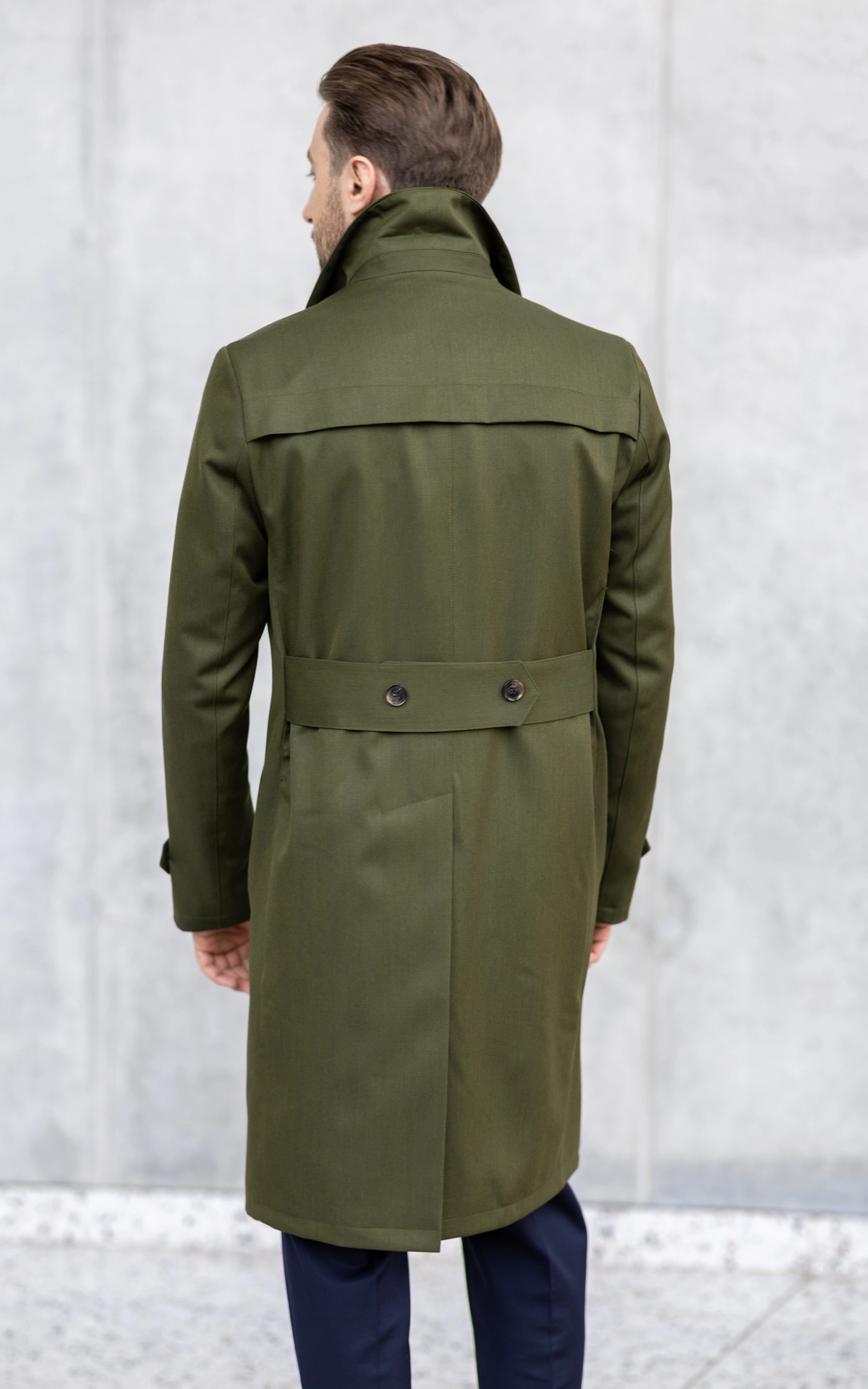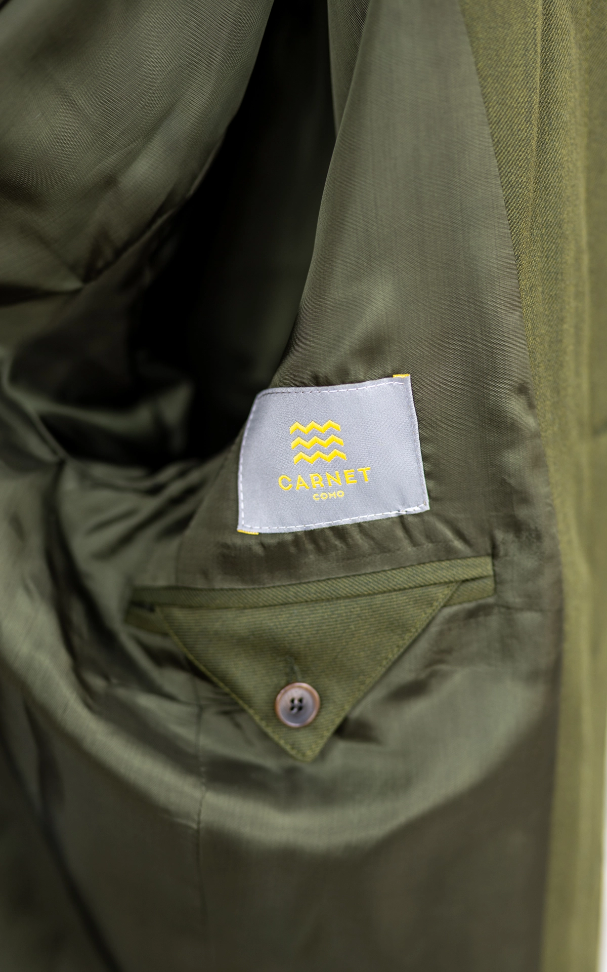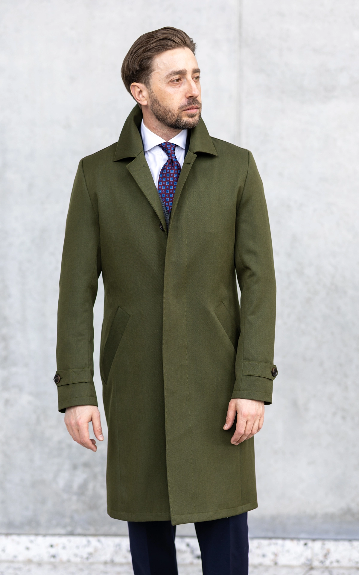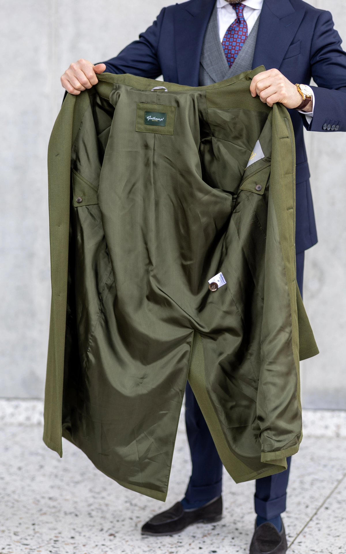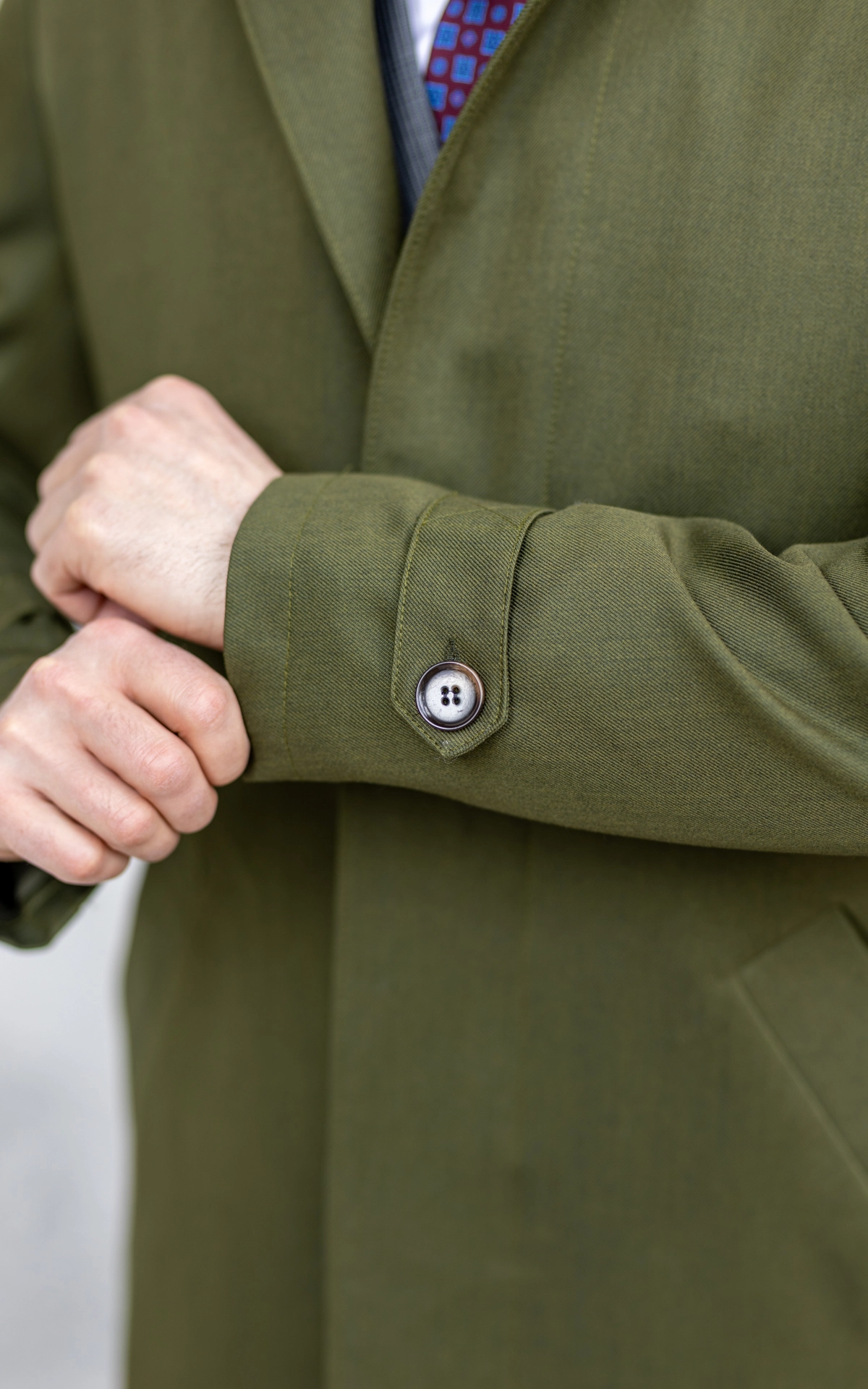 This dark gray herringbone coat is made from a blend of wool and cashmere. The coat reaches just above the knee, features light padding, and sharp lapels. It also has a back vent.
