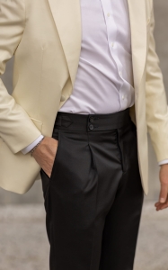 The model features a high waist, a two-button adjustable waistband, a classic 5 cm belt, and a single pleat. Buttons allow for comfortable use with suspenders, while the lightweight construction ensures all-day comfort.