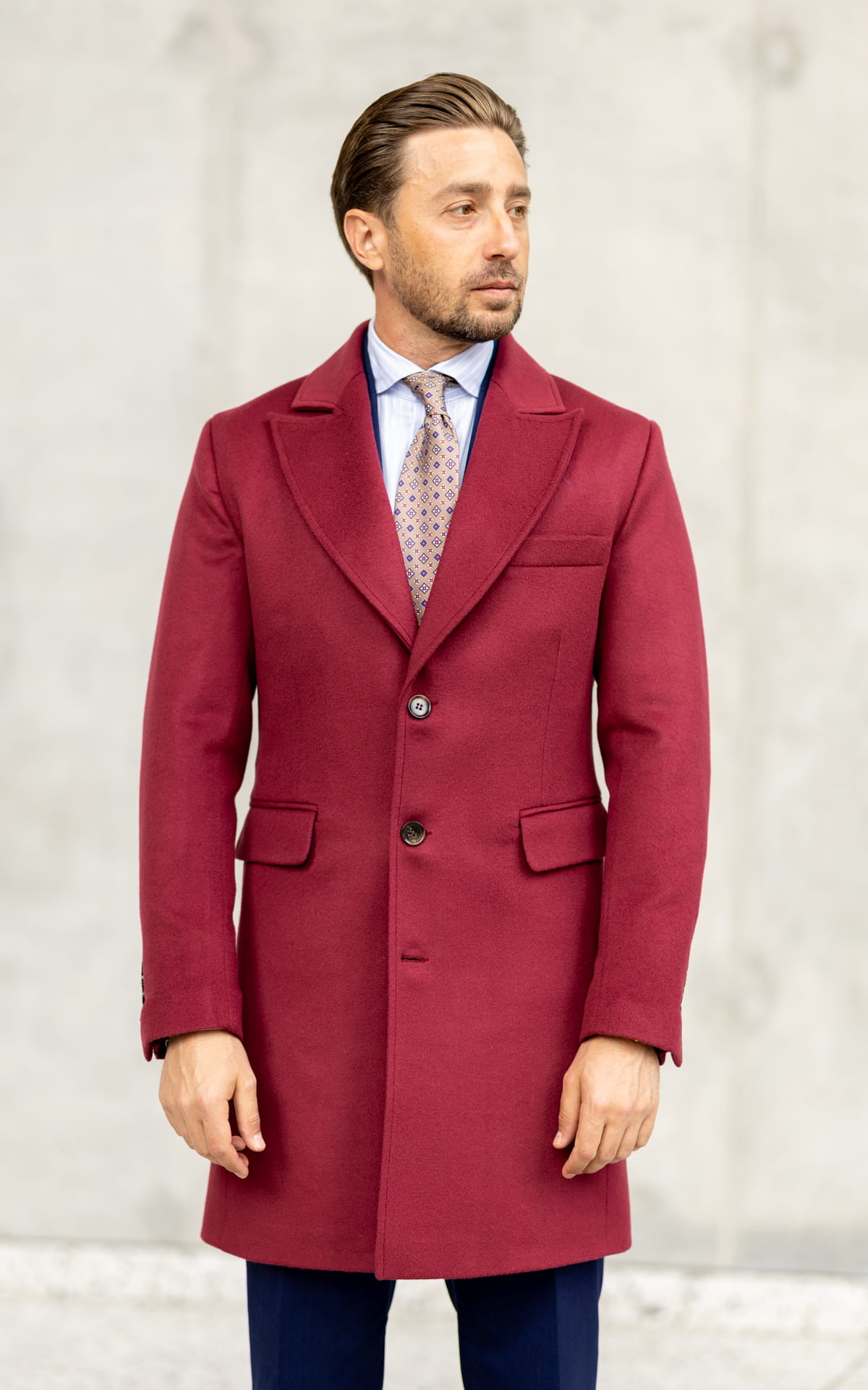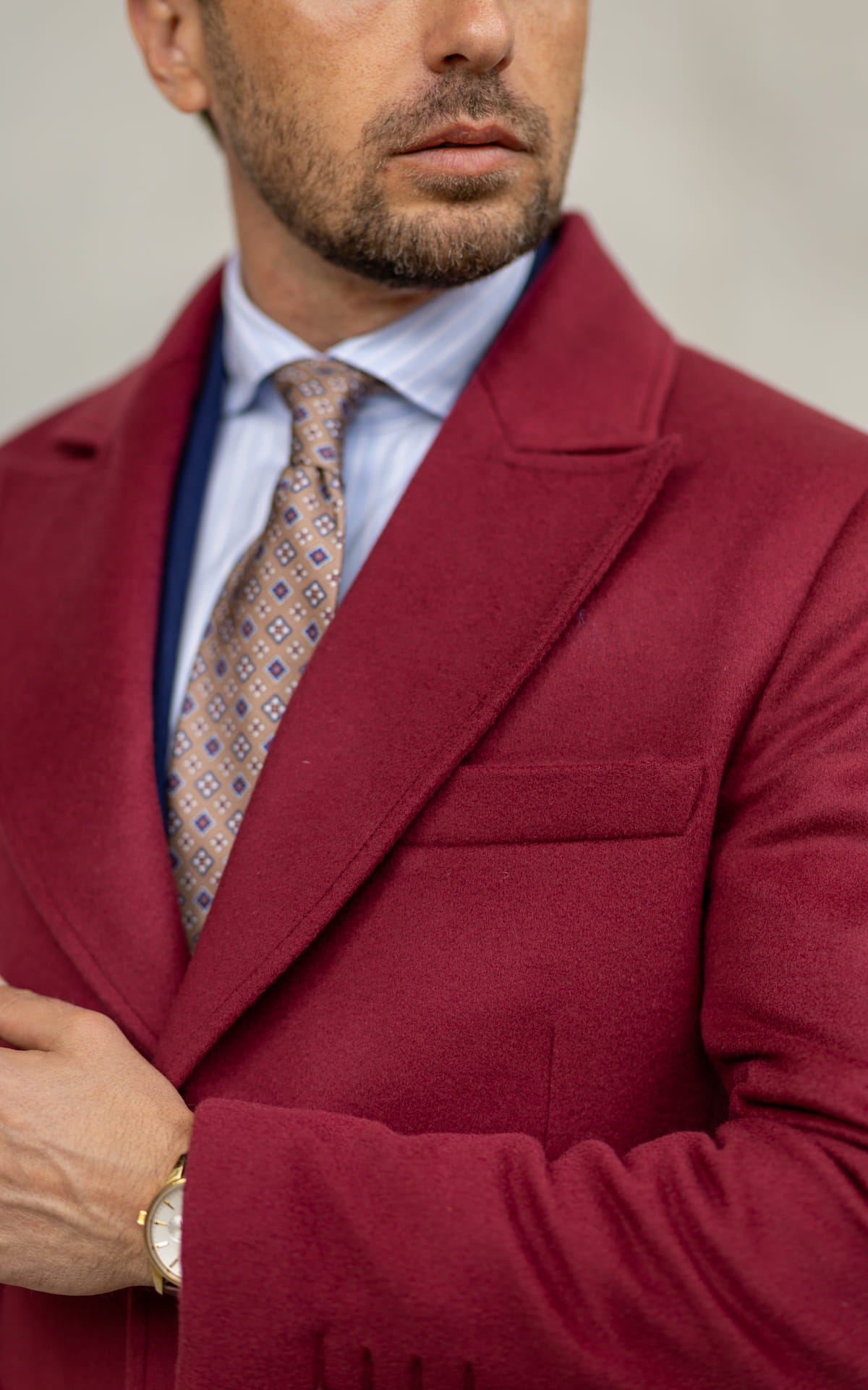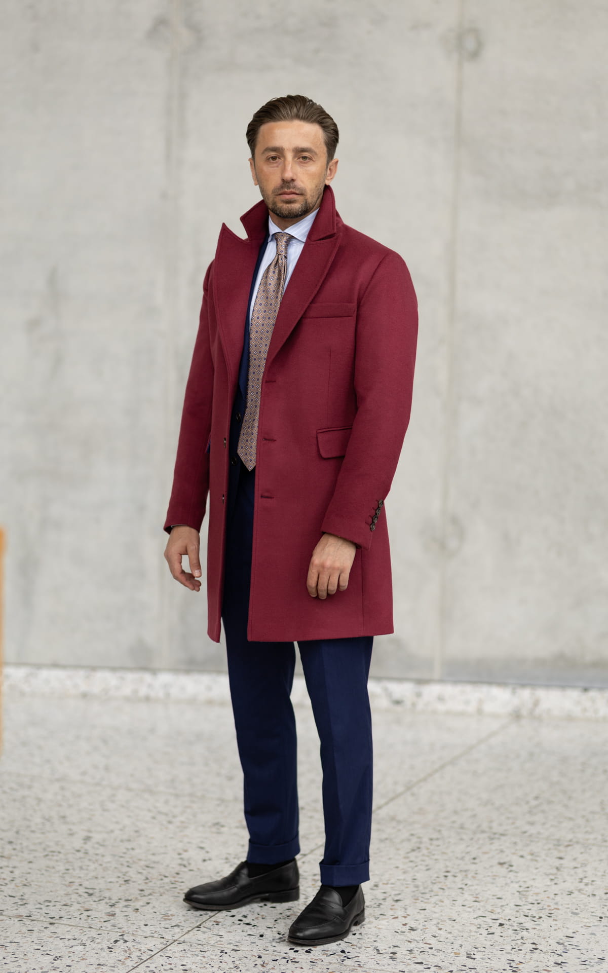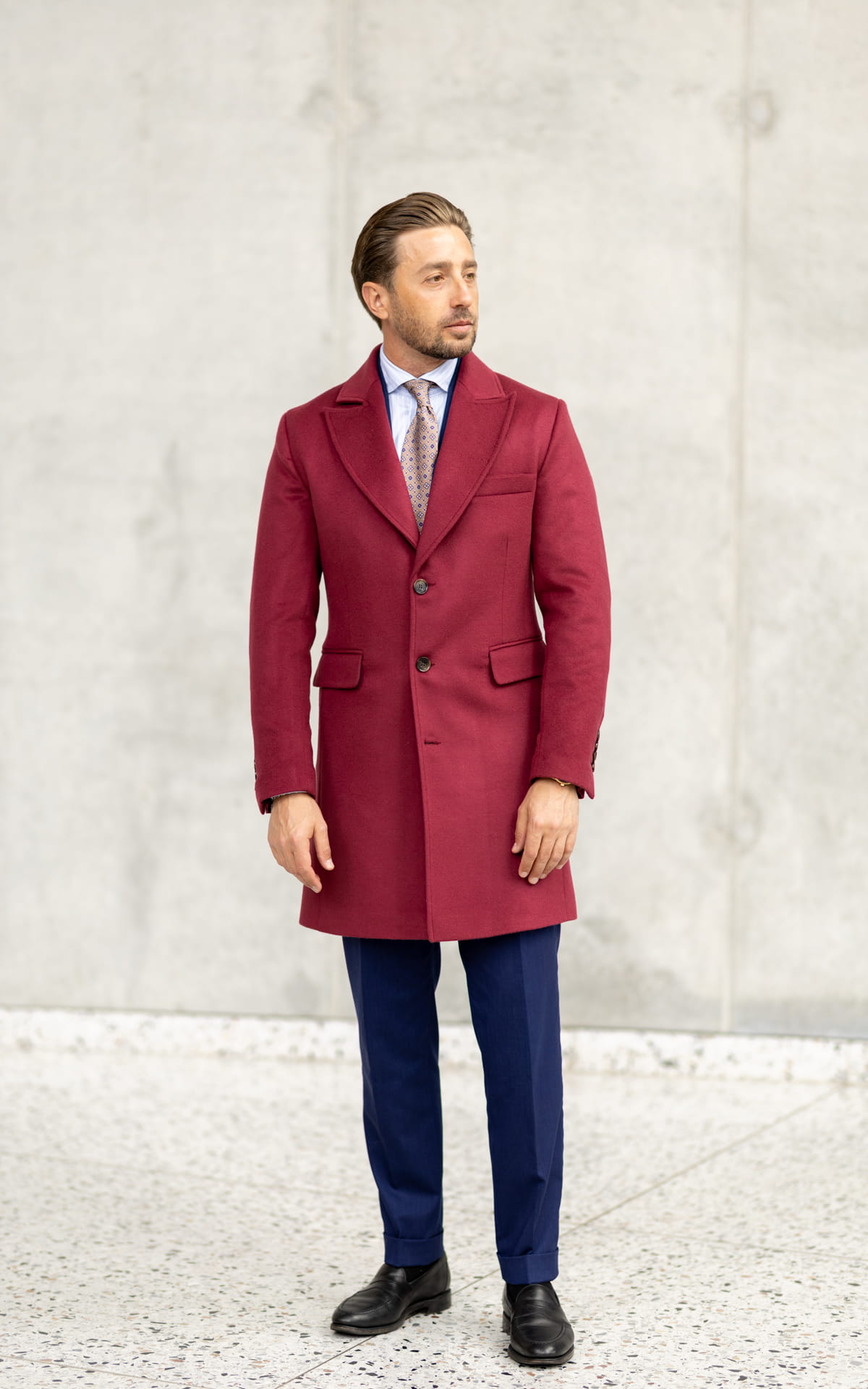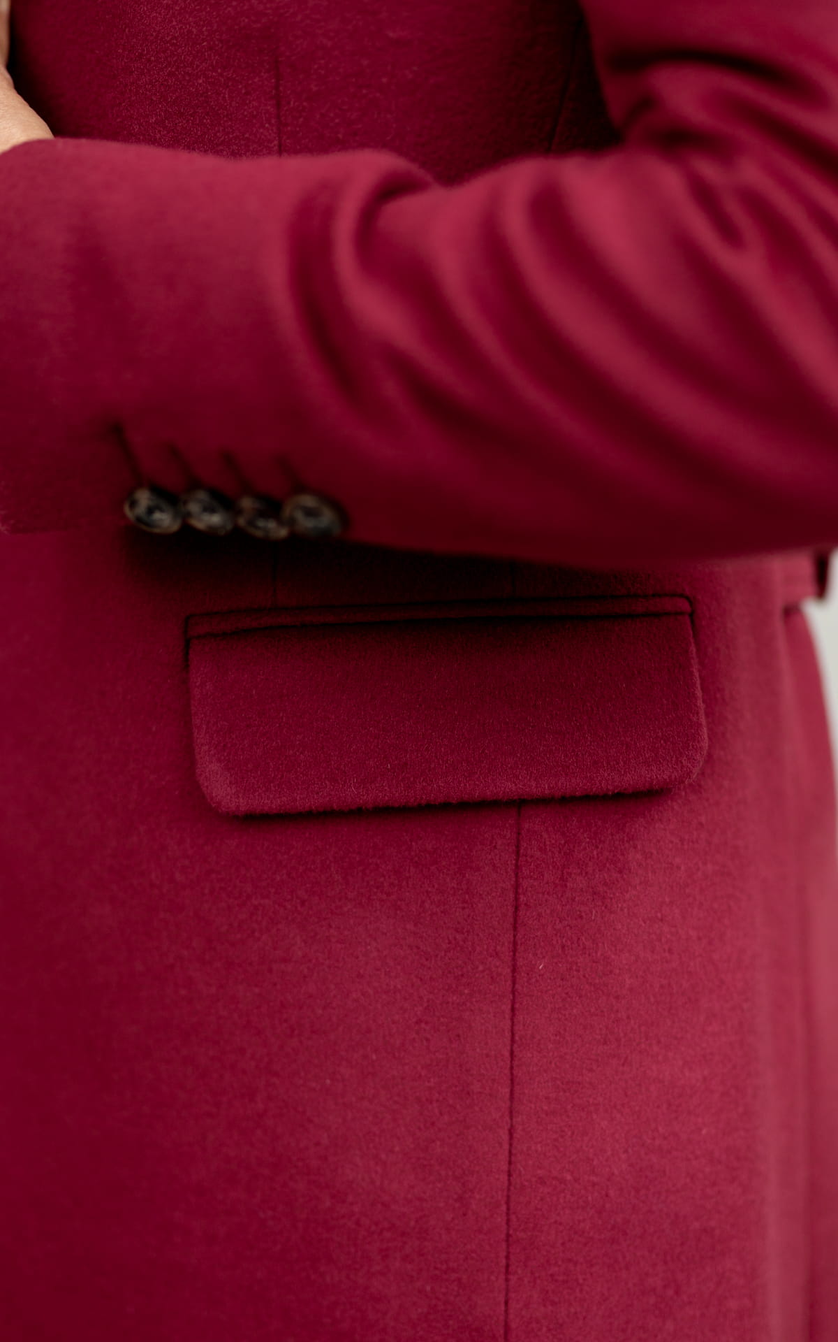 This blue coat is made from a blend of wool and cashmere. It features sharp lapels, a single-breasted design, and light shoulder padding. The coat is ideal for formal outfits, pairing perfectly with a suit.