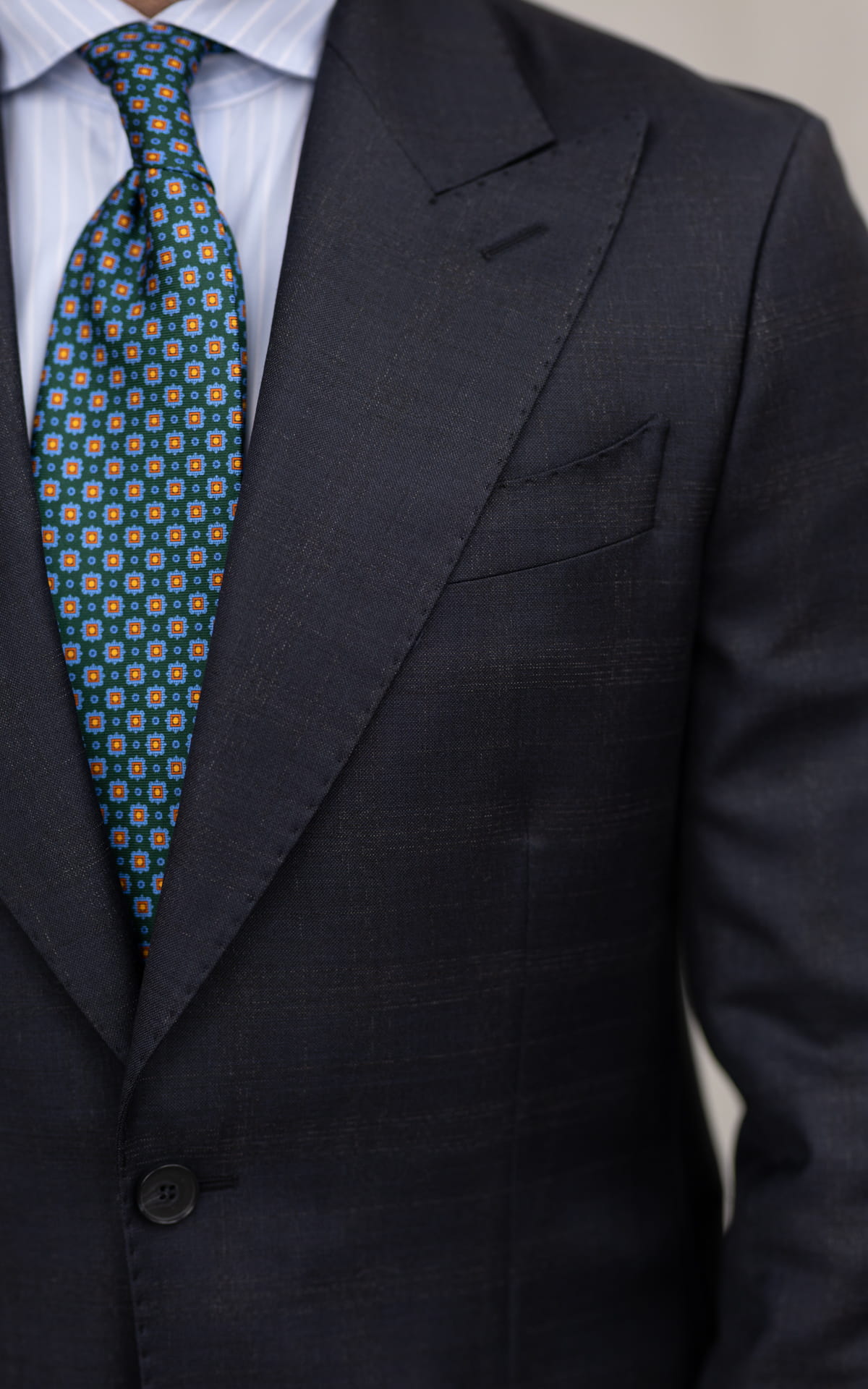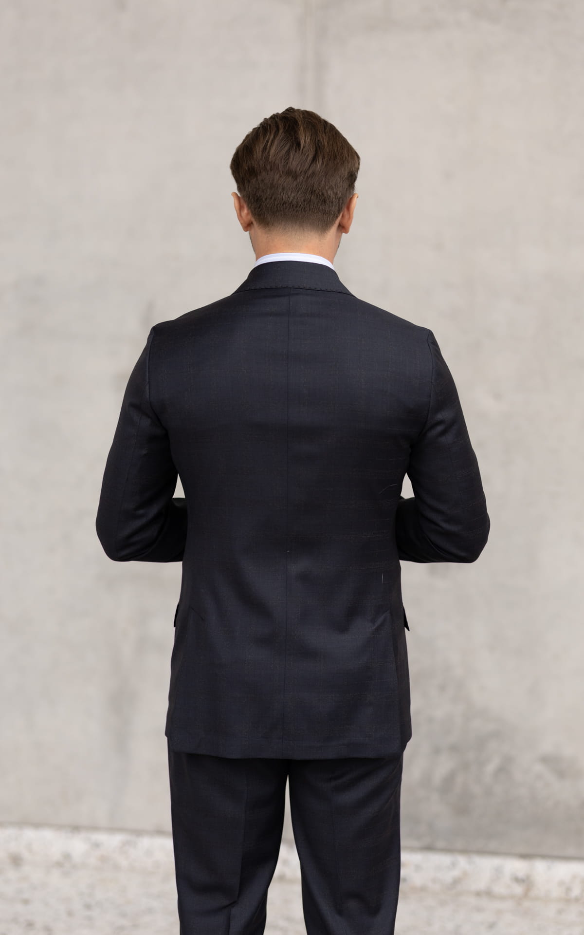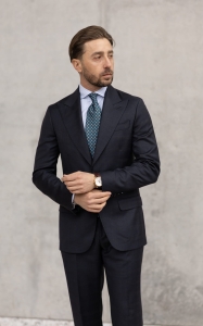 The Daytona navy suit is crafted from Loro Piana “Mooving” wool, a luxurious stretch fabric designed for busy days on the move. Lightweight and breathable, it delivers exceptional comfort, freedom of movement, and refined elegance.