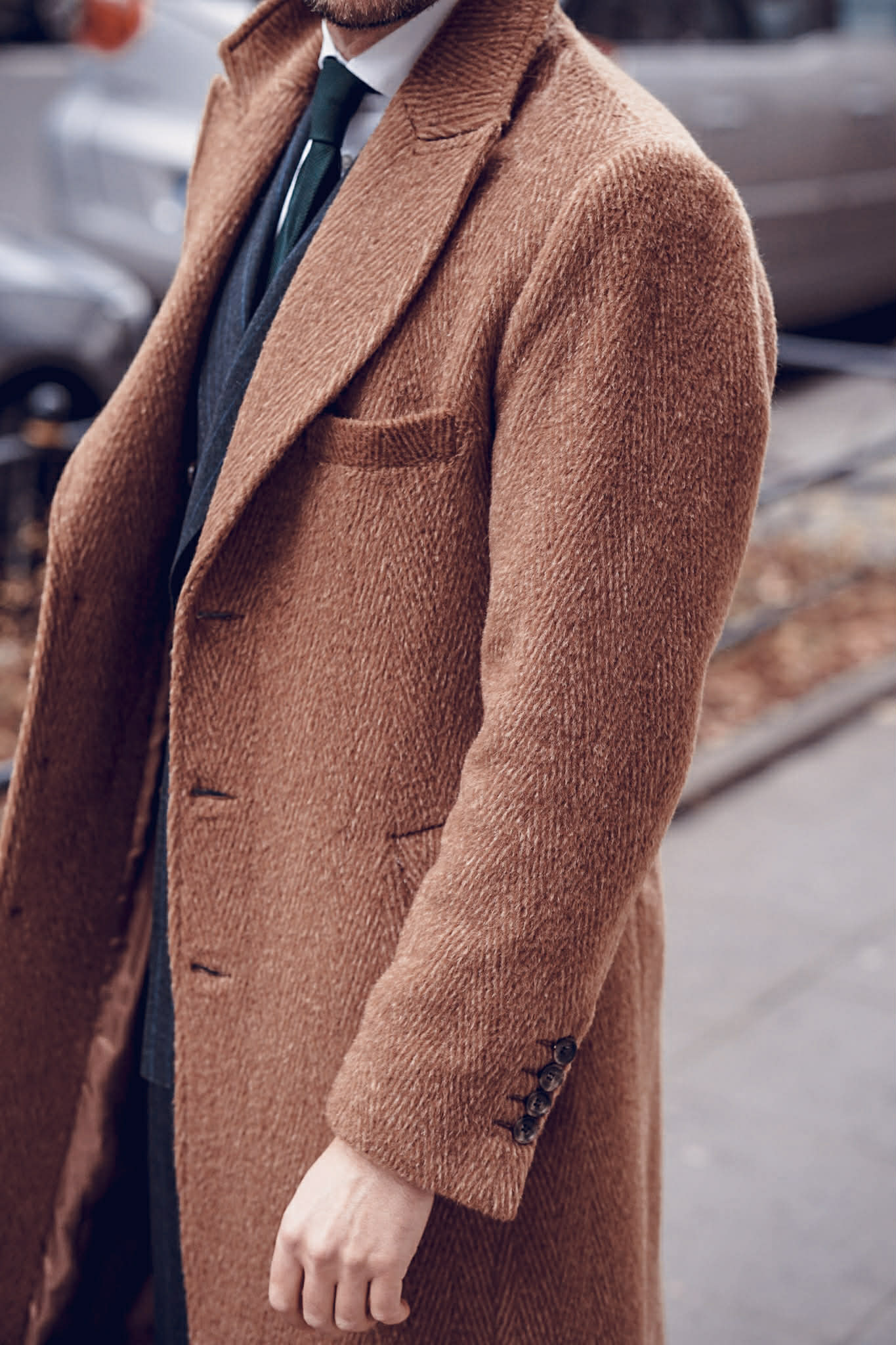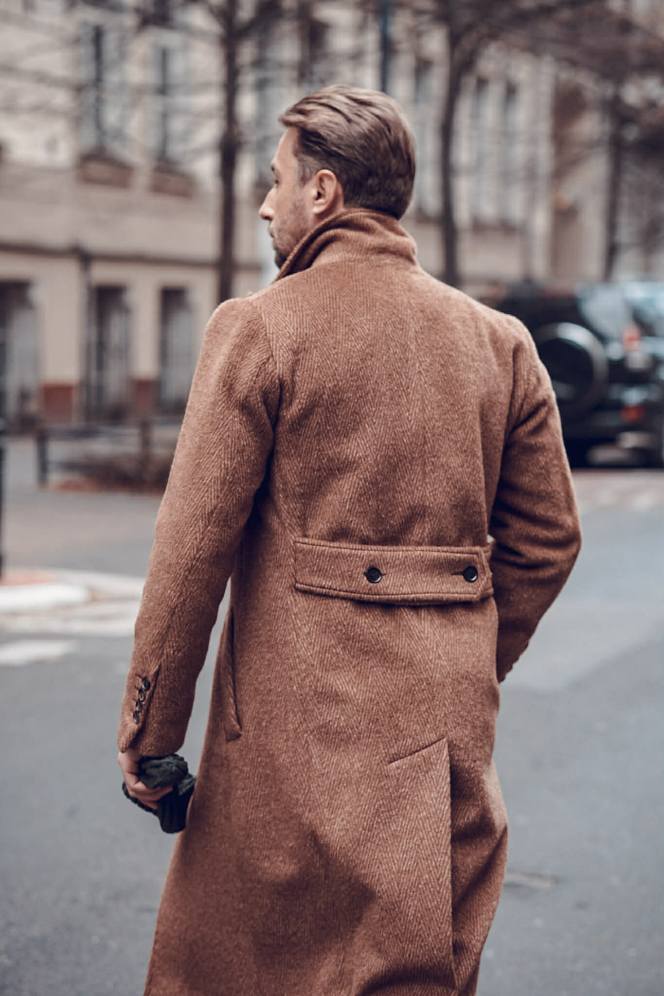 The coat falls below the knee, providing excellent thermal comfort while maintaining optimal air circulation. Despite its thick and soft texture, the alpaca wool prevents excessive perspiration, making it ideal for colder seasons.