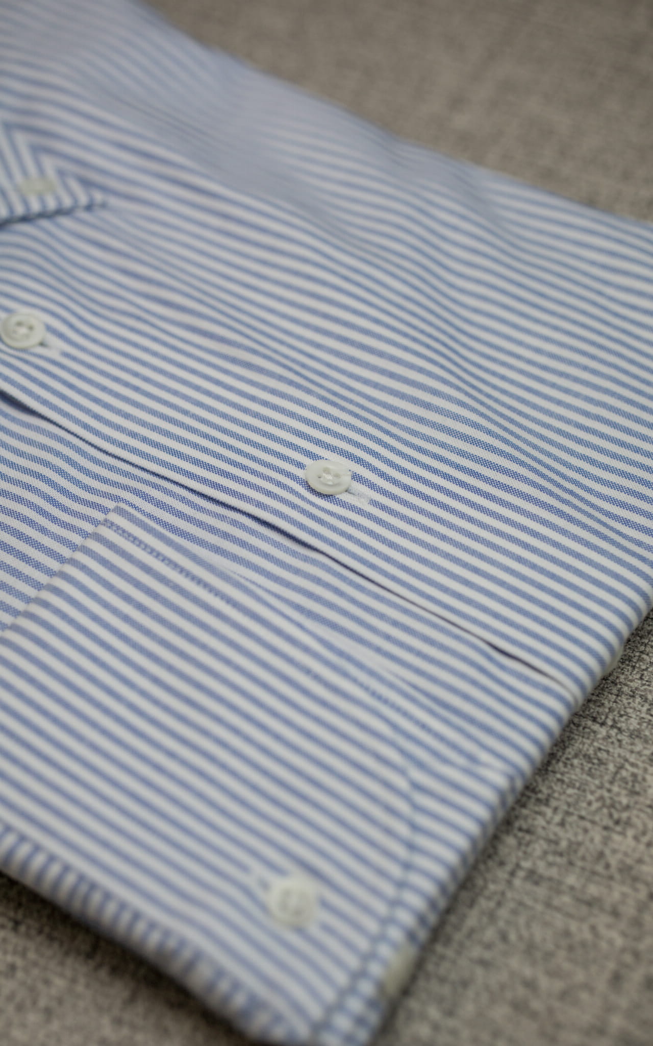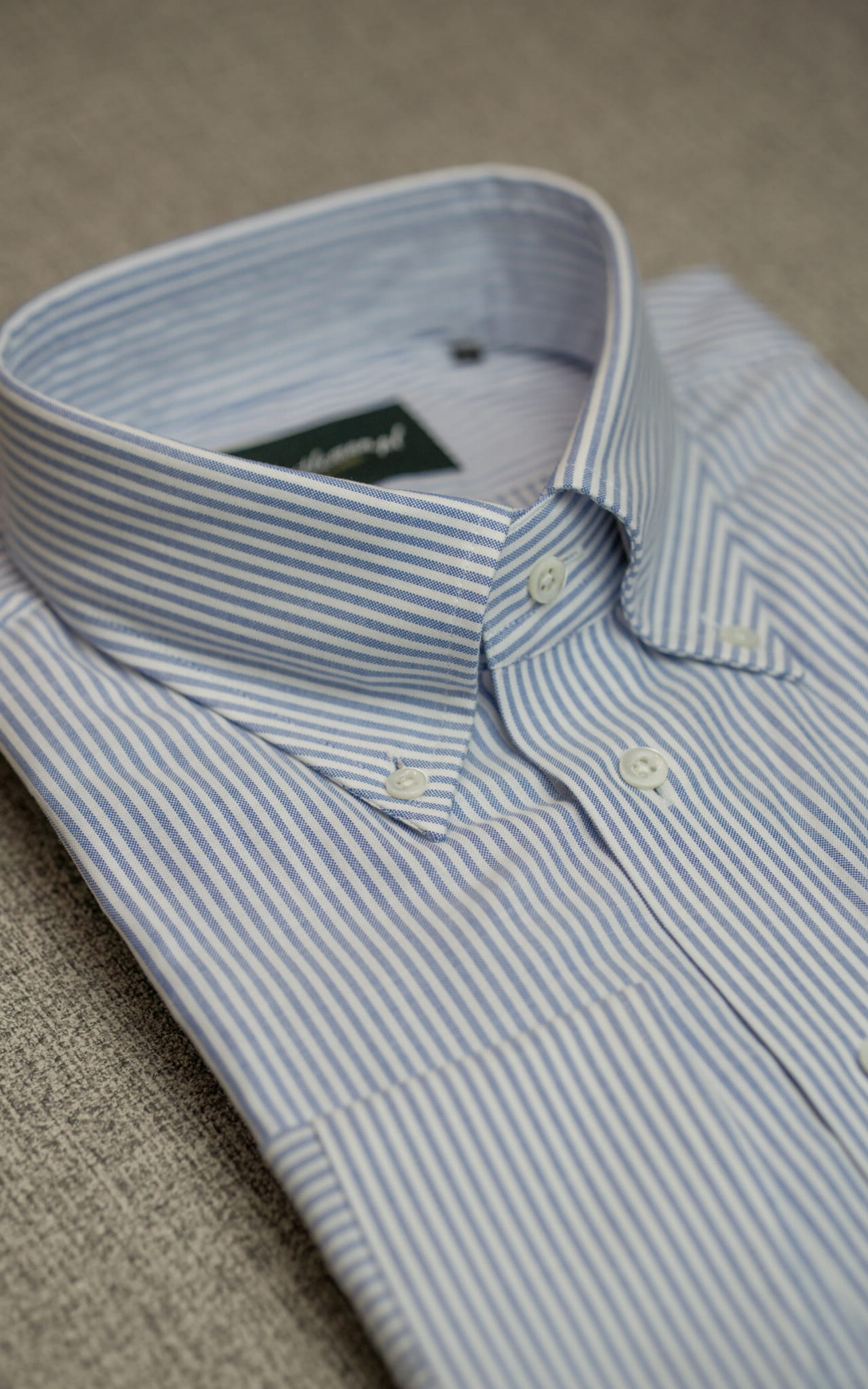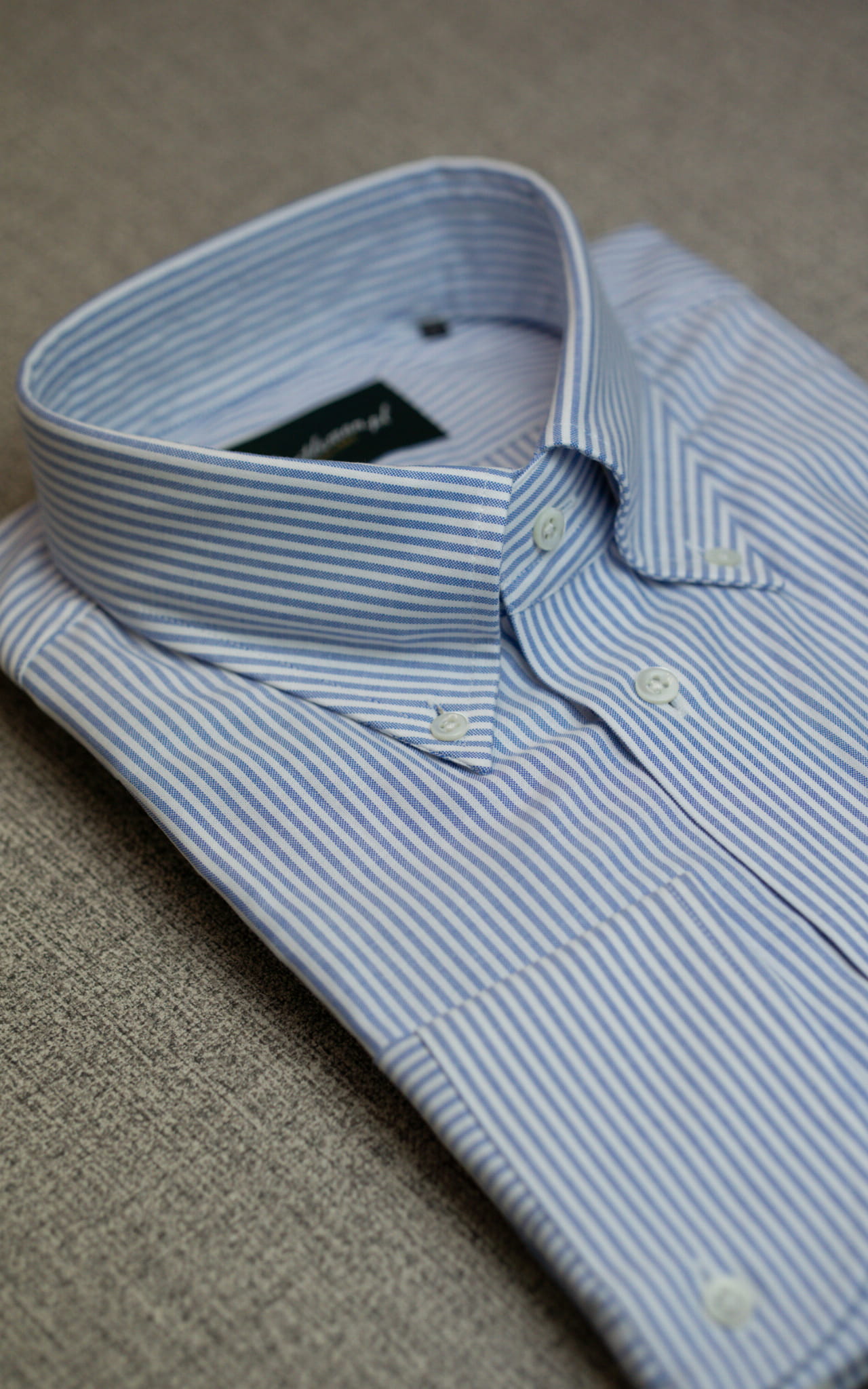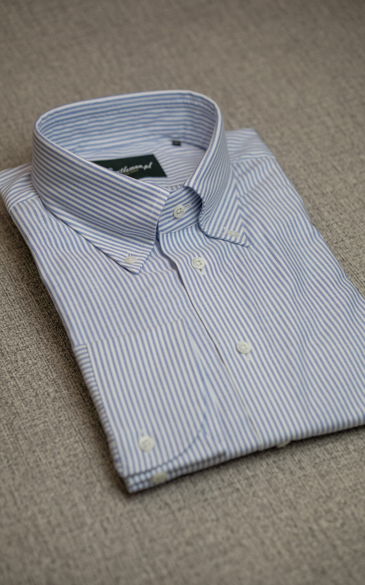 Koszula męska uszyta w Polsce z 100% bawełny oxford w niebiesko-biały prążek. Model posiada kołnierzyk button-down (9,5 cm), szwy bieliźniane oraz perłowe guziki, które zapewniają trwałość i eleganckie wykończenie. Lekka i przewiewna, doskonała do codziennych stylizacji, zarówno casualowych, jak i smart casual.