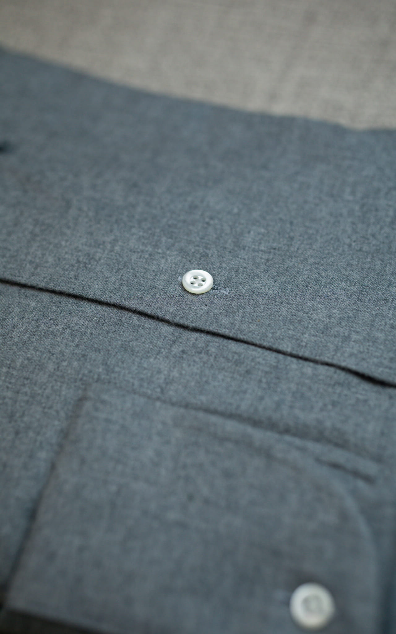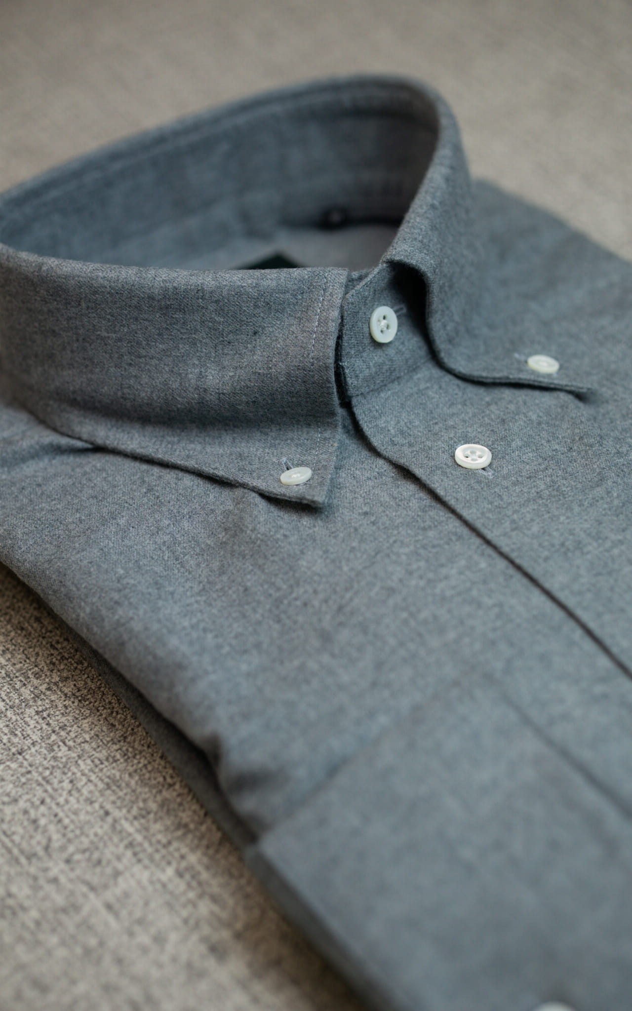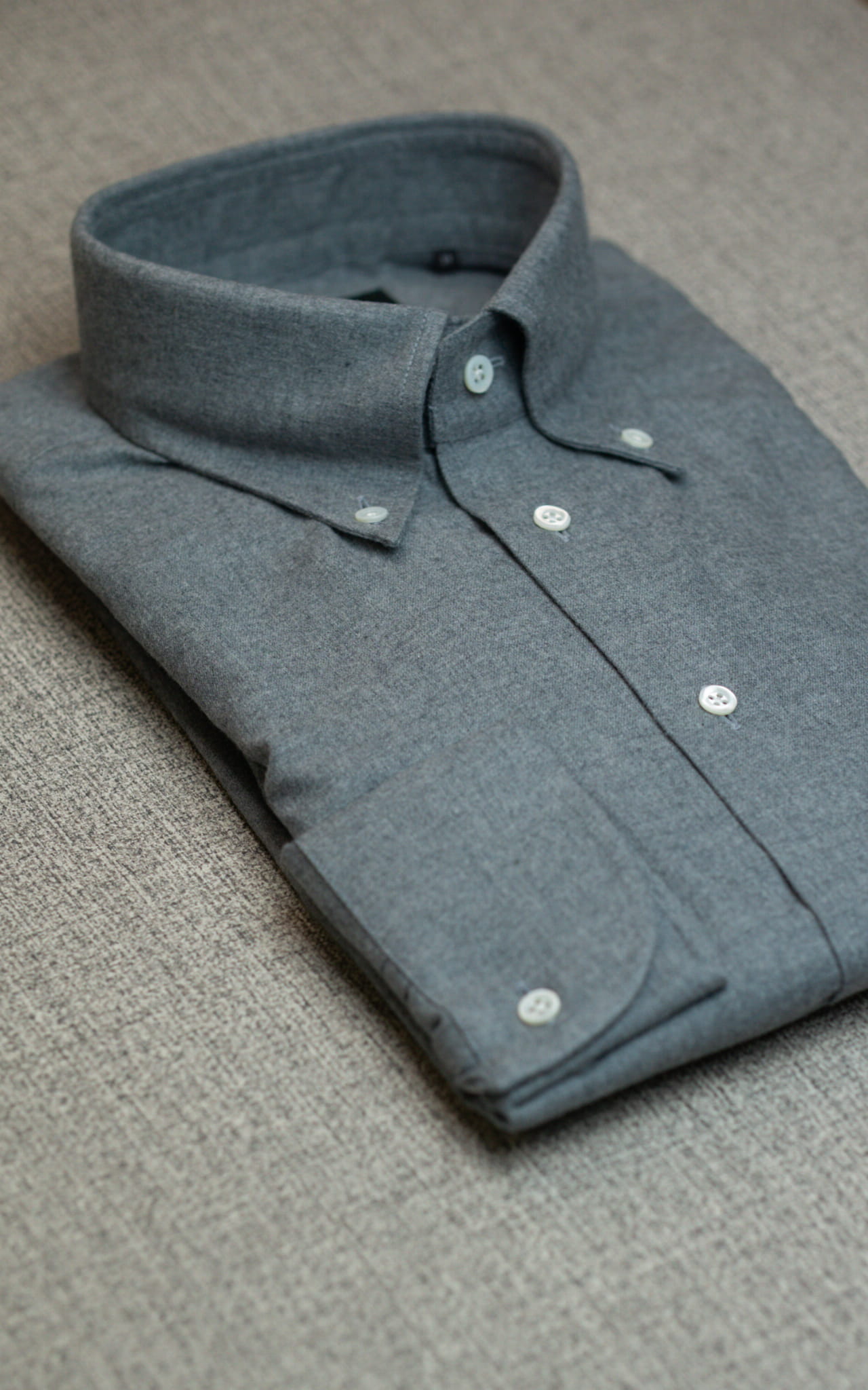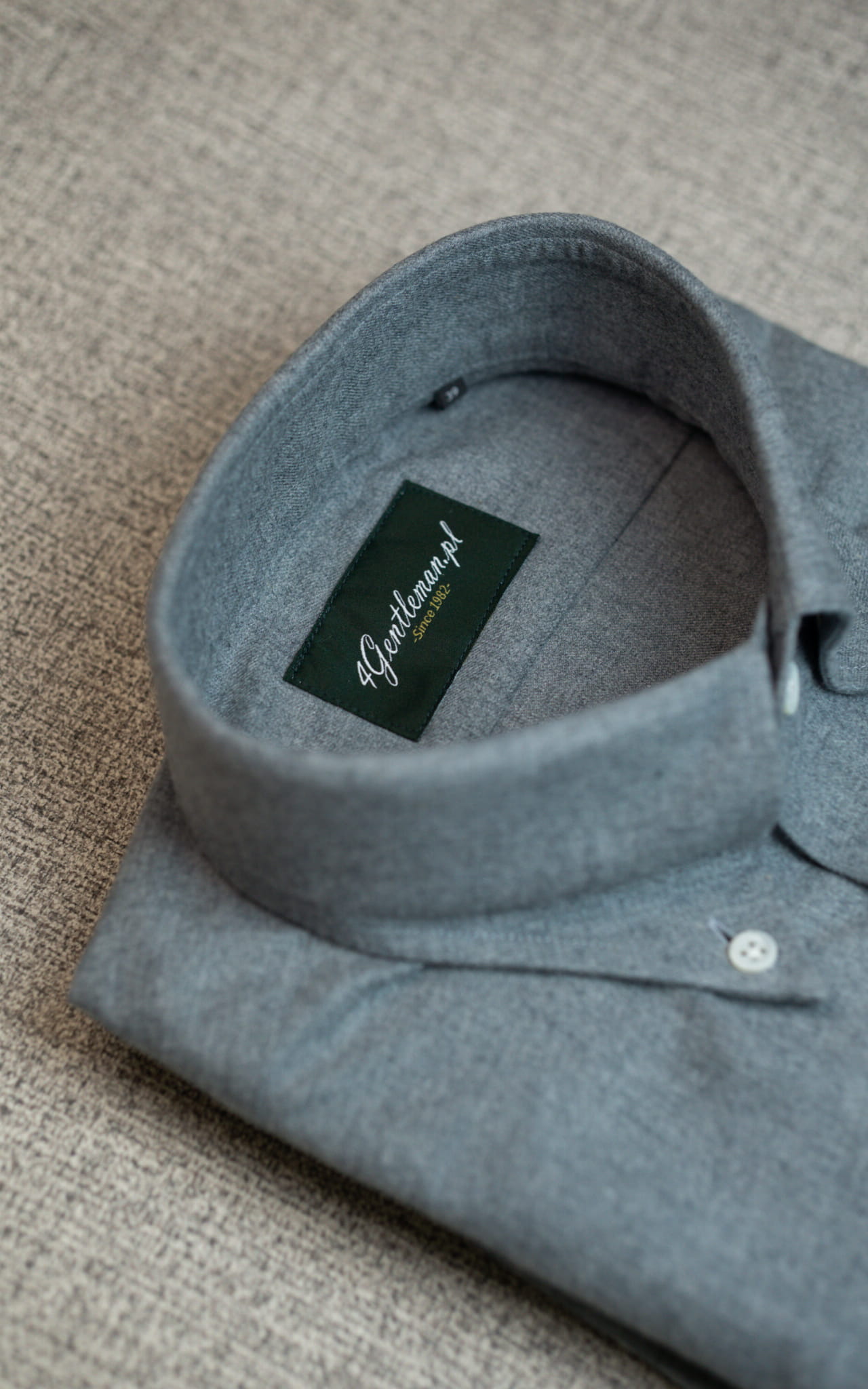 Miękka koszula męska z flaneli bawełnianej w szarym kolorze, z kołnierzykiem button-down (wyłogi 9,5 cm). Uszyta w Polsce, na szwach bieliźnianych, z perłowymi guzikami. Uniwersalna i neutralna kolorystycznie — idealna na sezon jesienno-zimowy oraz do zestawów smart casual i pod warstwy.