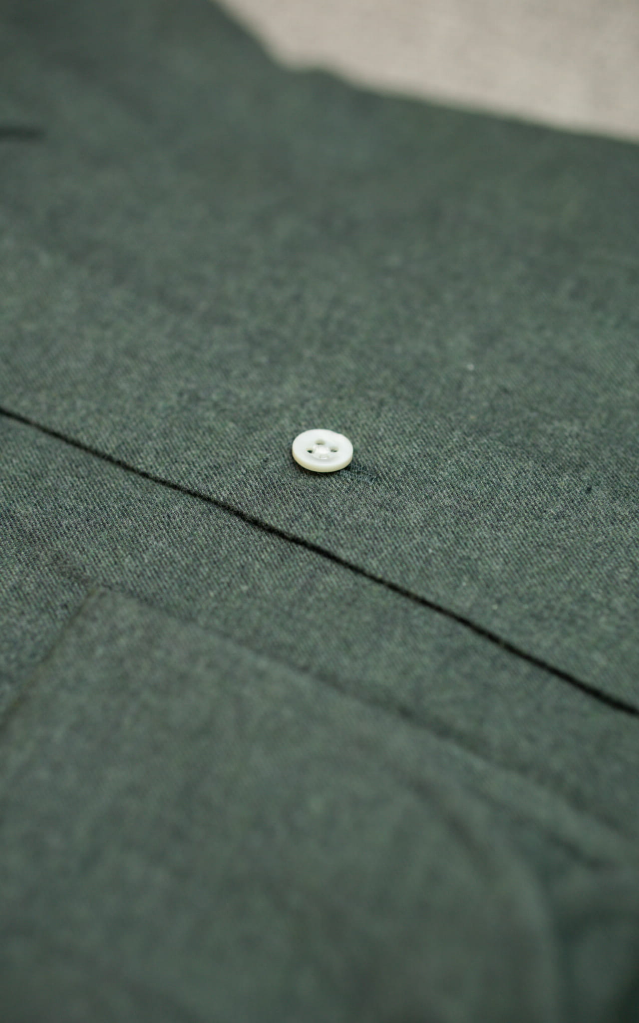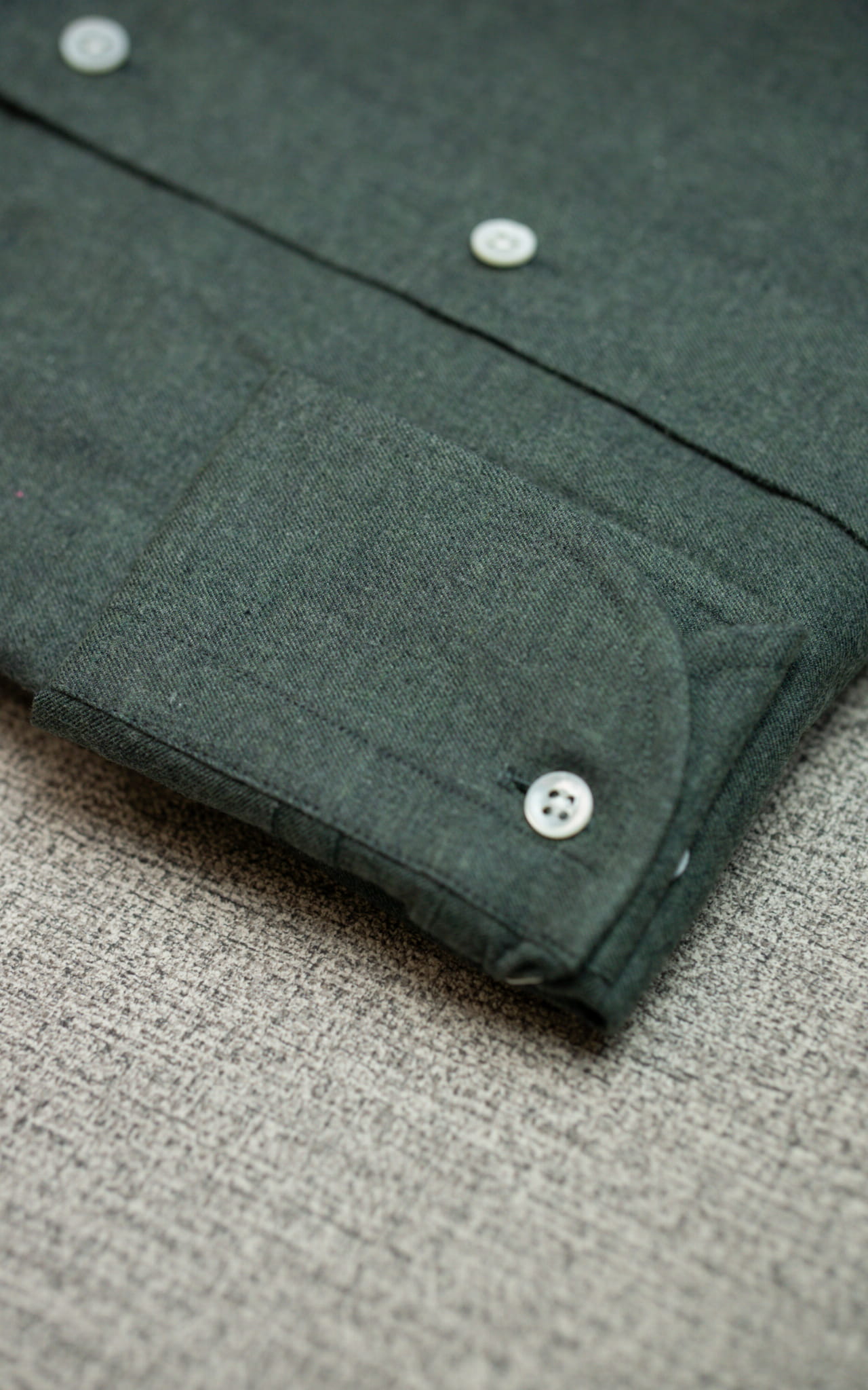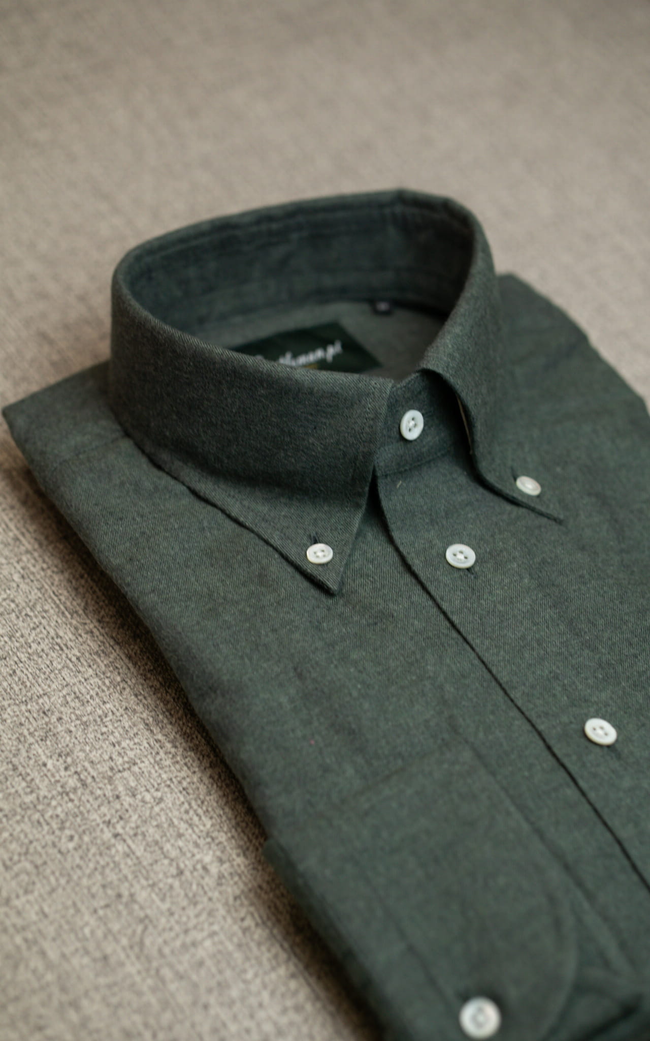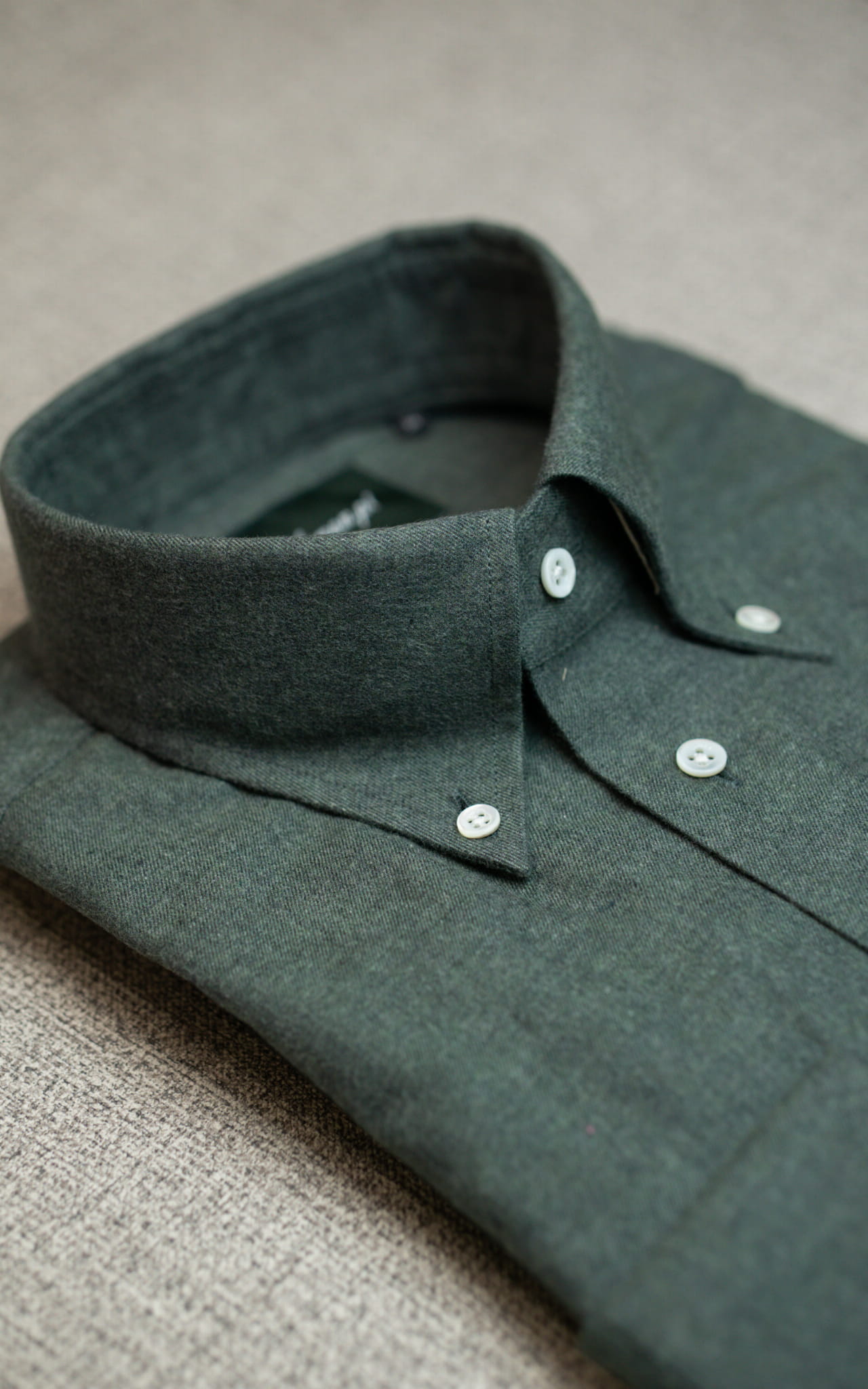 Miękka koszula męska flanelowa w ciemnej zieleni, z kołnierzykiem button-down (wyłogi 9,5 cm). Uszyta w Polsce, na szwach bieliźnianych, z perłowymi guzikami odpornymi na temperaturę i pękanie. Idealna na sezon jesienno-zimowy, do zestawów smart casual oraz pod warstwy.