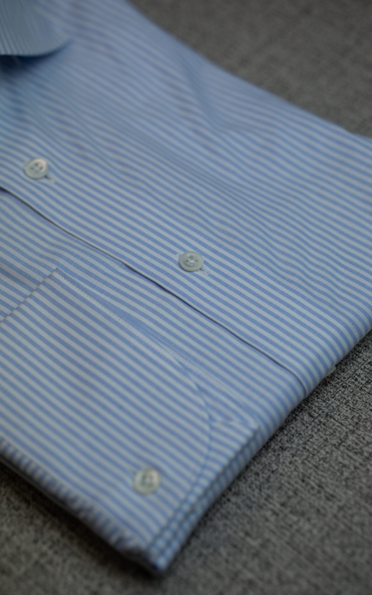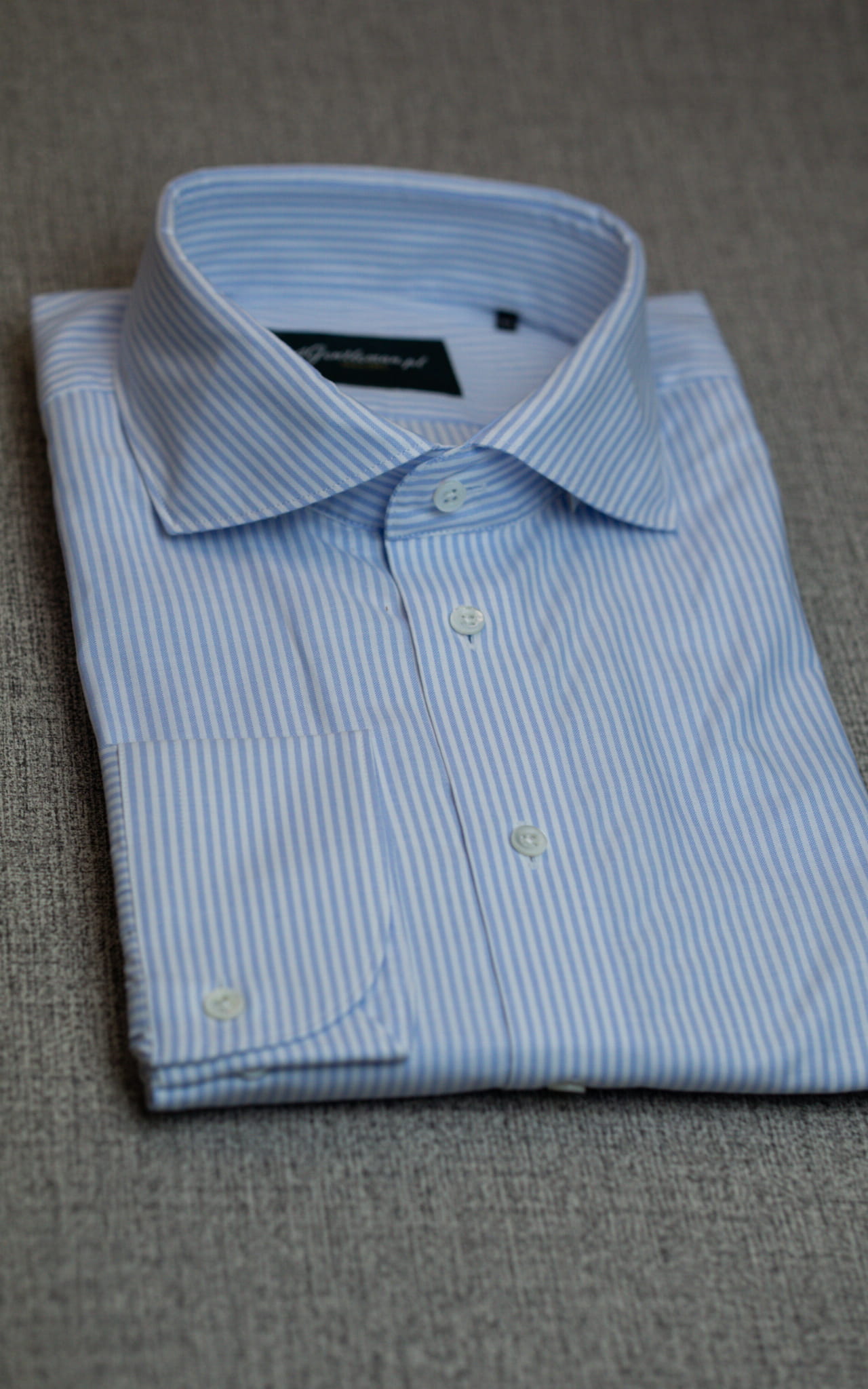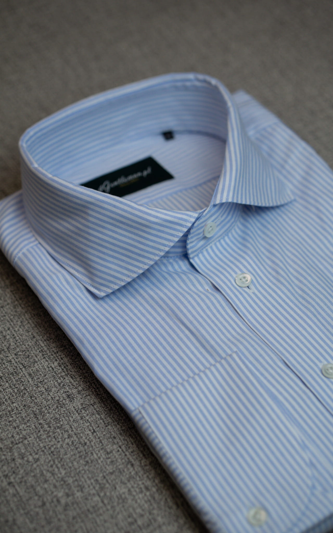 Lekka koszula męska z bawełny oxford w niebiesko-biały prążek, z kołnierzykiem włoskim, uszyta w Polsce na szwach bieliźnianych z perłowymi guzikami. Idealna do codziennych stylizacji i casualowych zestawów smart casual, zapewnia komfort noszenia przez cały rok.