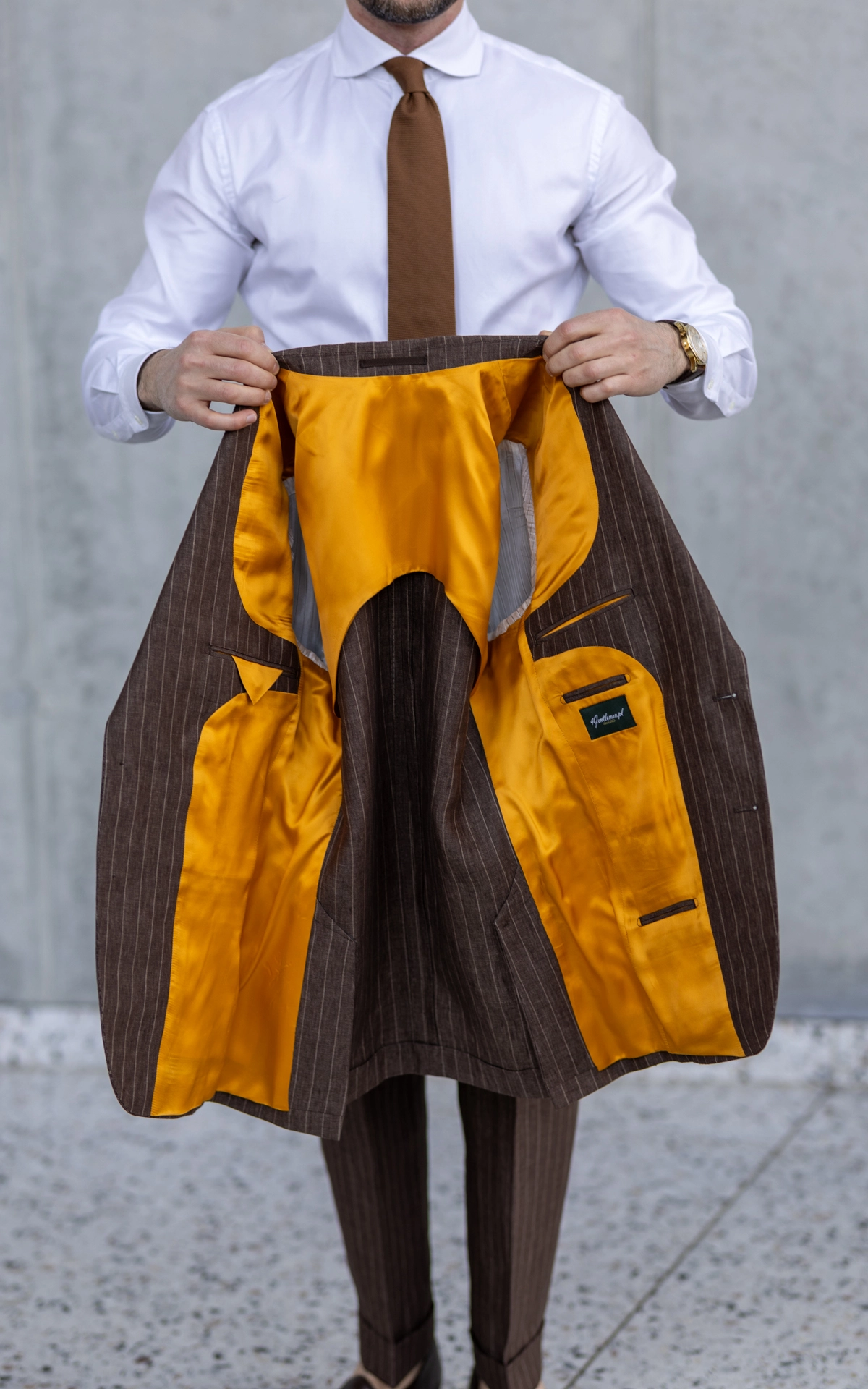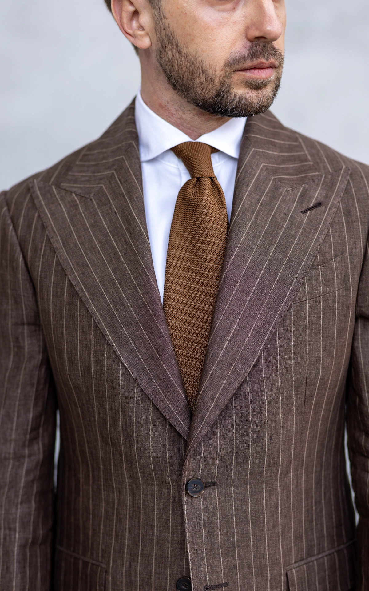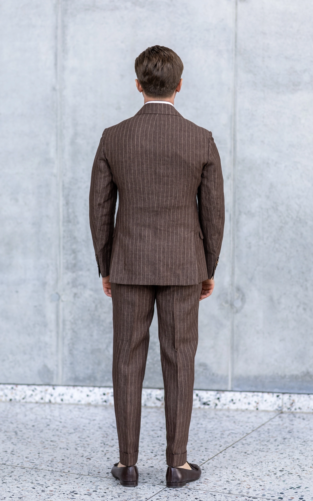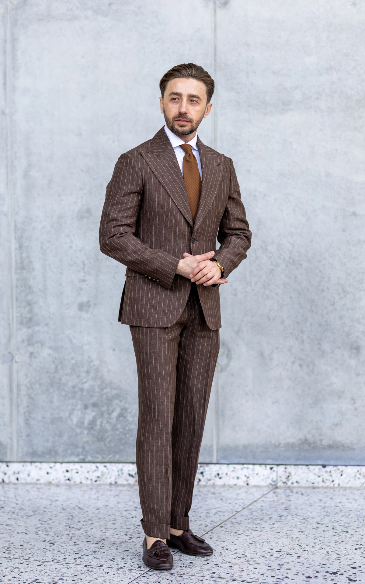 Klasyczny brązowy garnitur męski w delikatny prążek, wykonany w 100% z wysokiej jakości lnu, idealny na cieplejsze dni. Lekka i oddychająca tkanina zapewnia maksymalny komfort noszenia, jednocześnie zachowując elegancki, wyrafinowany charakter.