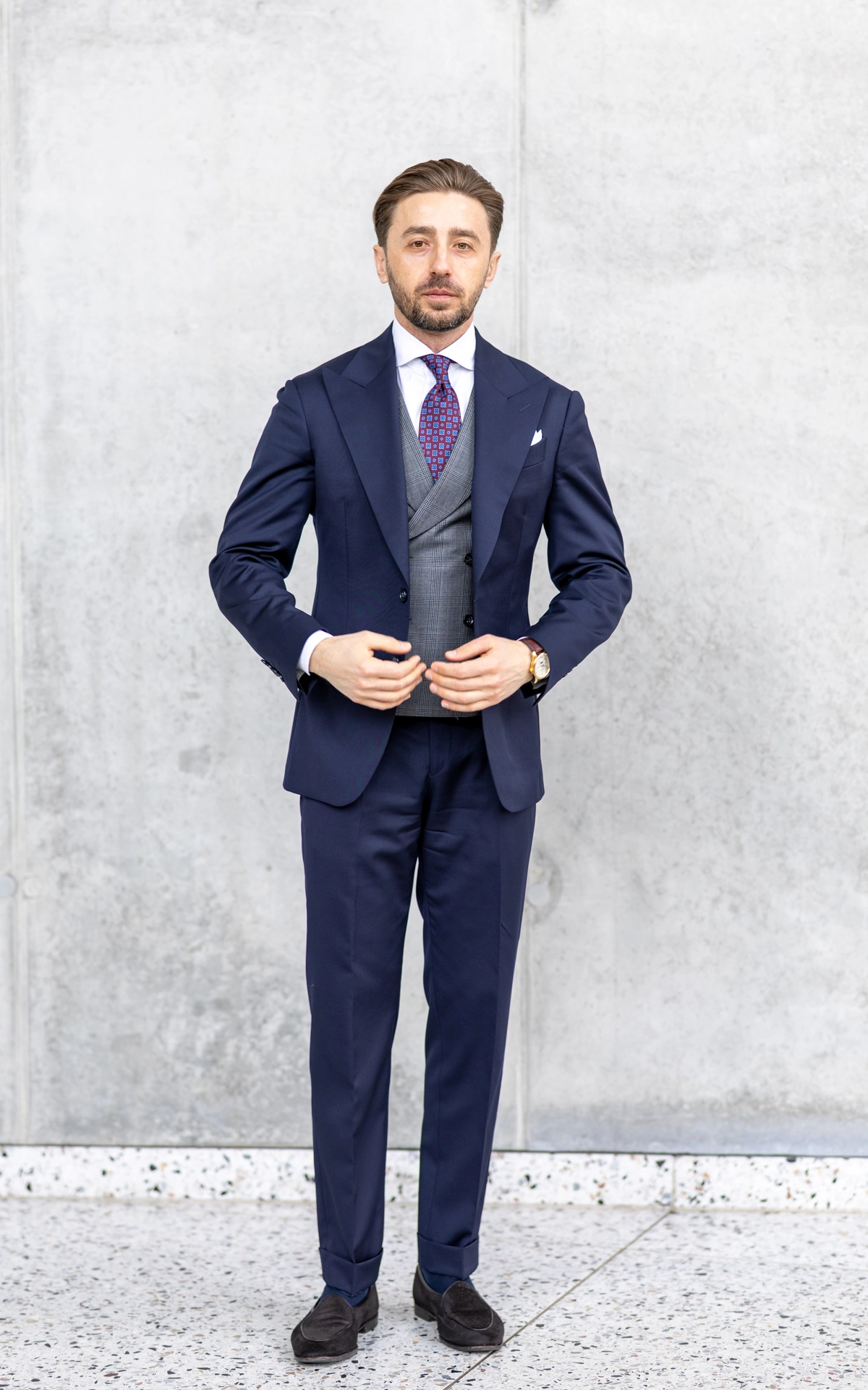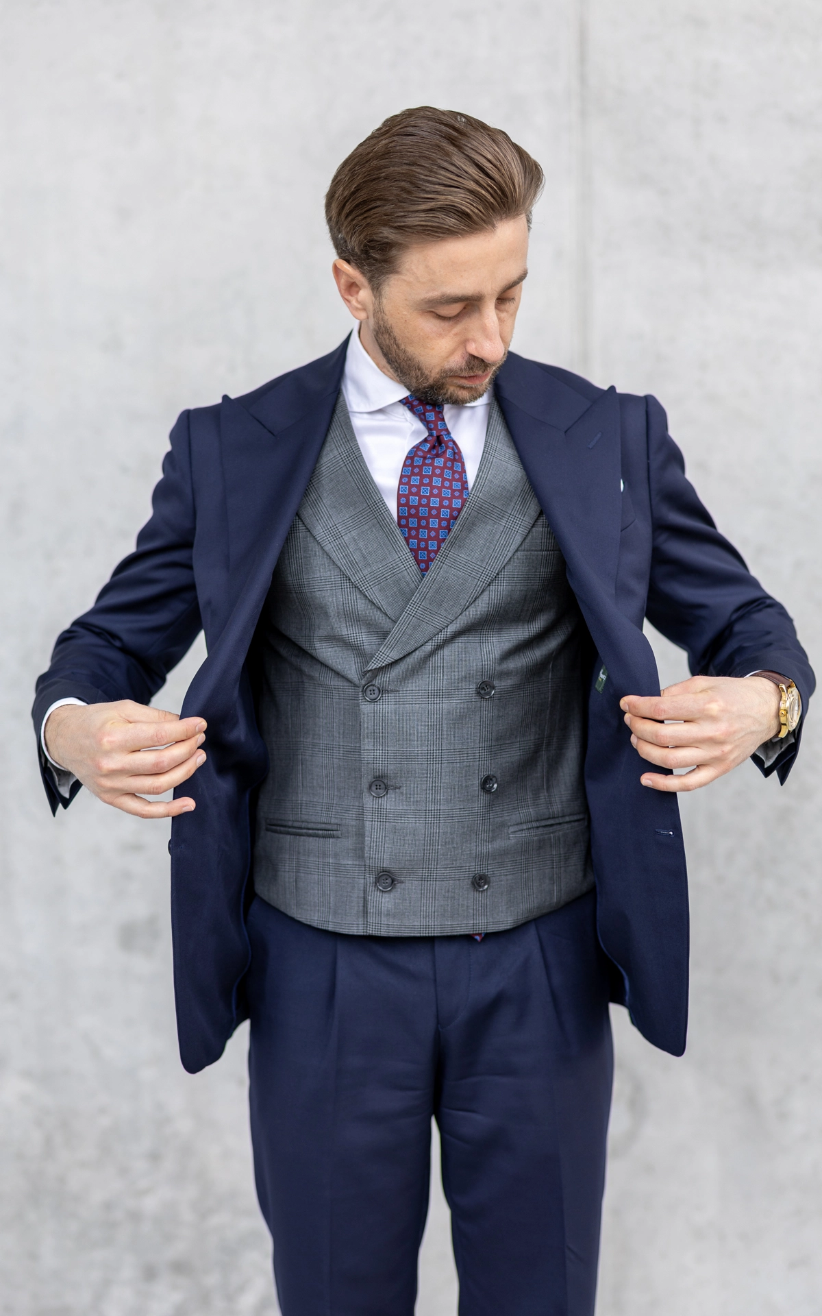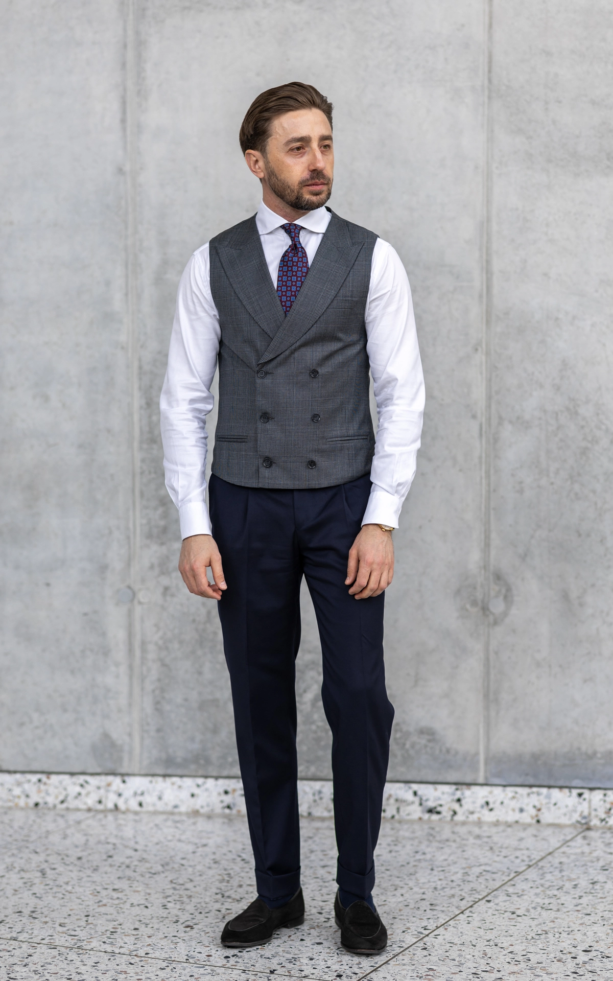 Dwurzędowa kamizelka Szara Krata została uszyta z 100% wełny od włoskiego producenta VBC. Model ten łączy klasyczny, dwurzędowy krój z nowoczesnym wykończeniem, tworząc elegancką i uniwersalną kamizelkę, którą można nosić zarówno w zestawach garniturowych, jak i smart casualowych.