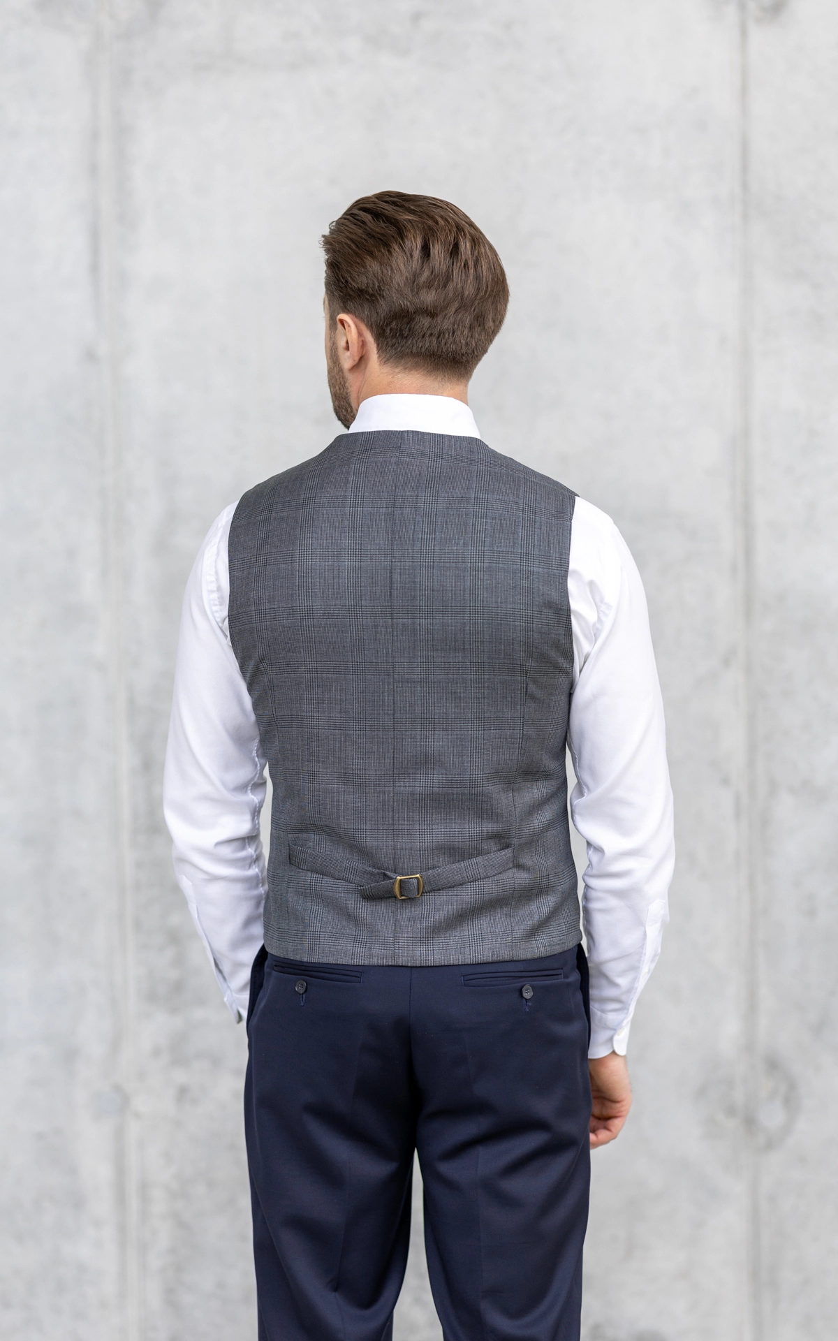 Kamizelka ma ostre klapy, a plecy wykonane są z tej samej tkaniny co przód, co pozwala nosić ją również solo bez marynarki. Pasek regulacyjny z tyłu umożliwia idealne dopasowanie do sylwetki.