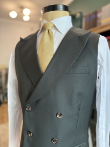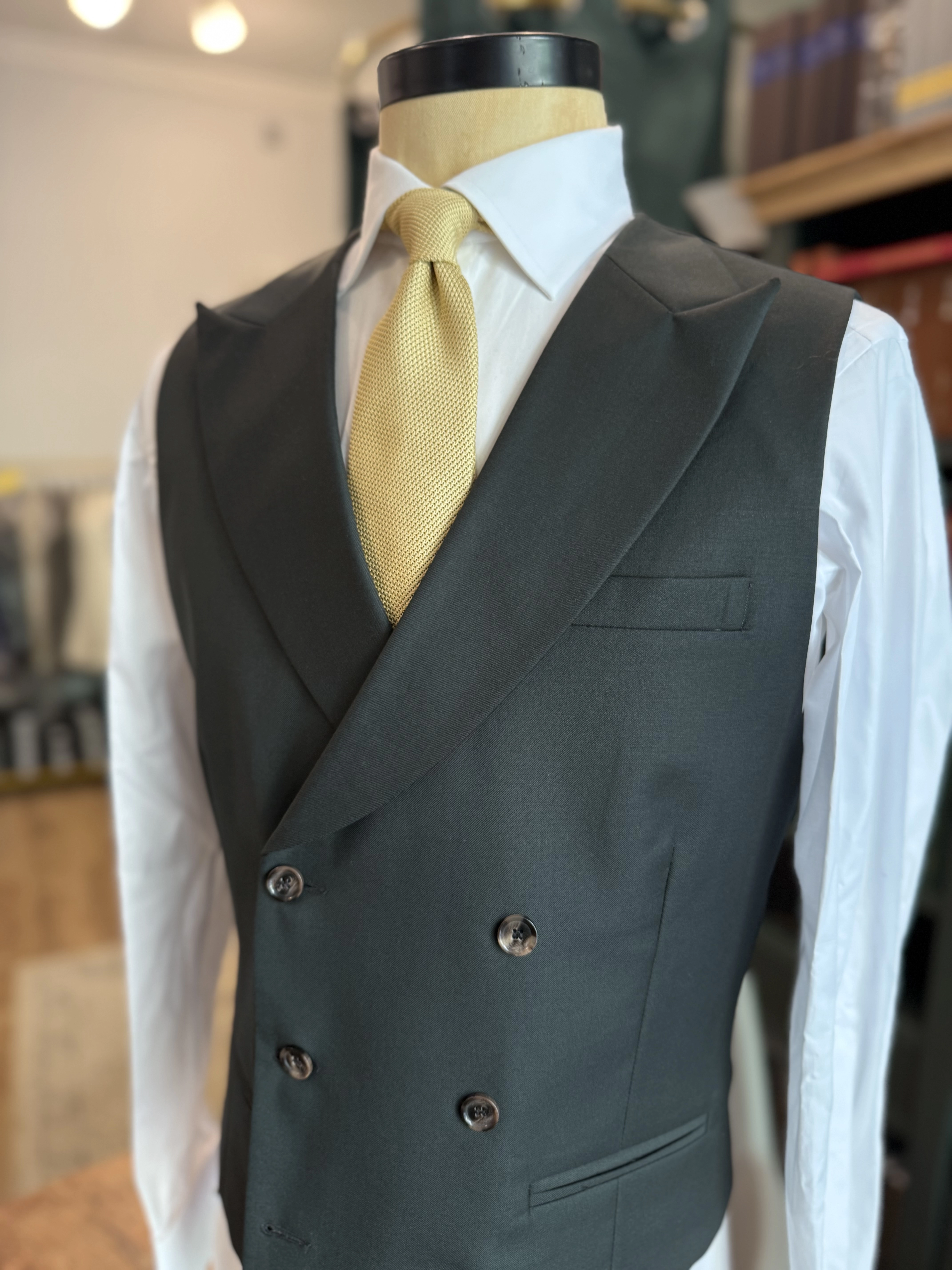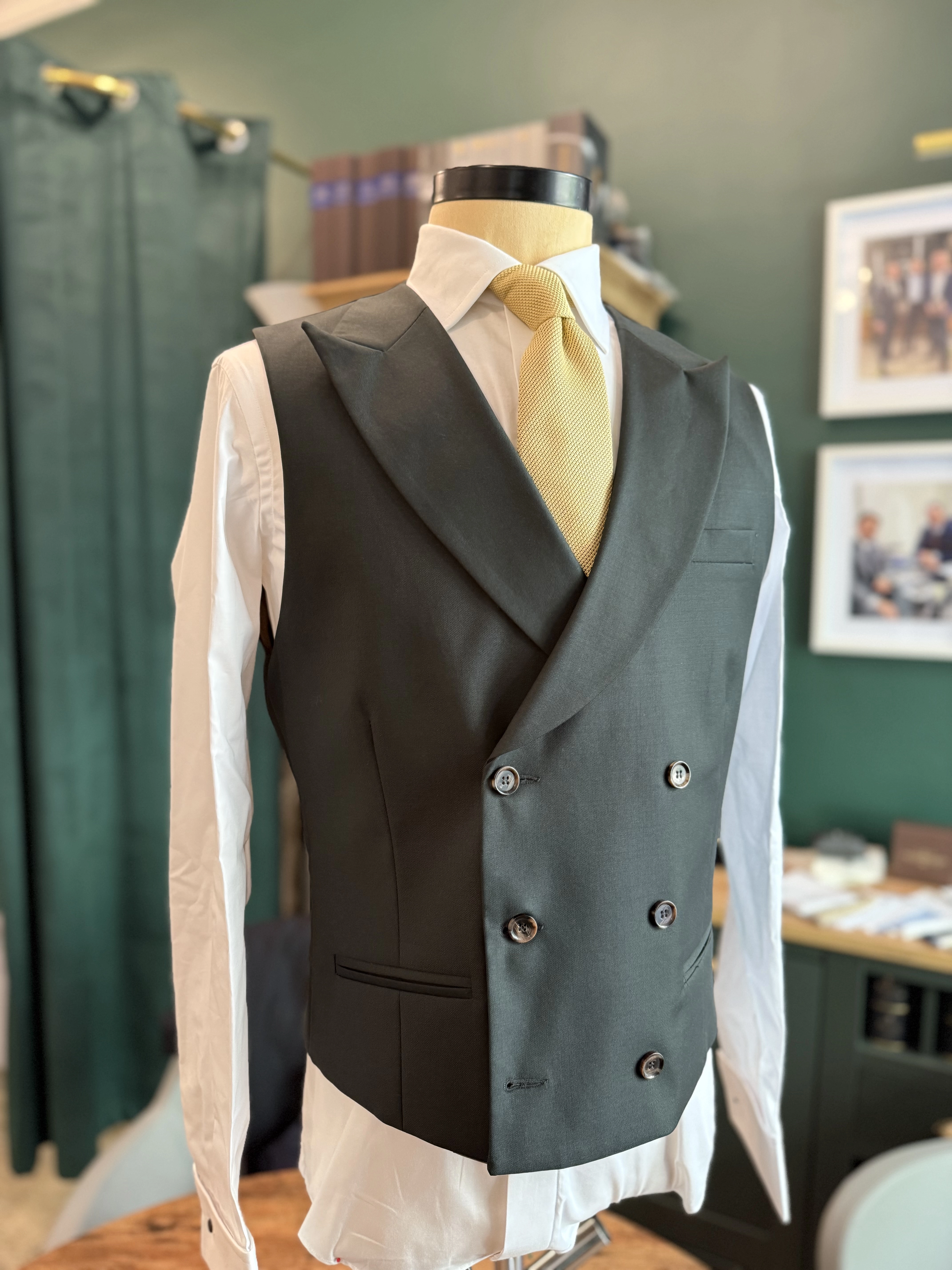 Dwurzędowa kamizelka zielona została uszyta z 100% wełny od włoskiego producenta VBC. Model ten łączy klasyczny, dwurzędowy krój z nowoczesnym wykończeniem, tworząc elegancką i uniwersalną kamizelkę, którą można nosić zarówno w zestawach garniturowych, jak i smart casualowych.