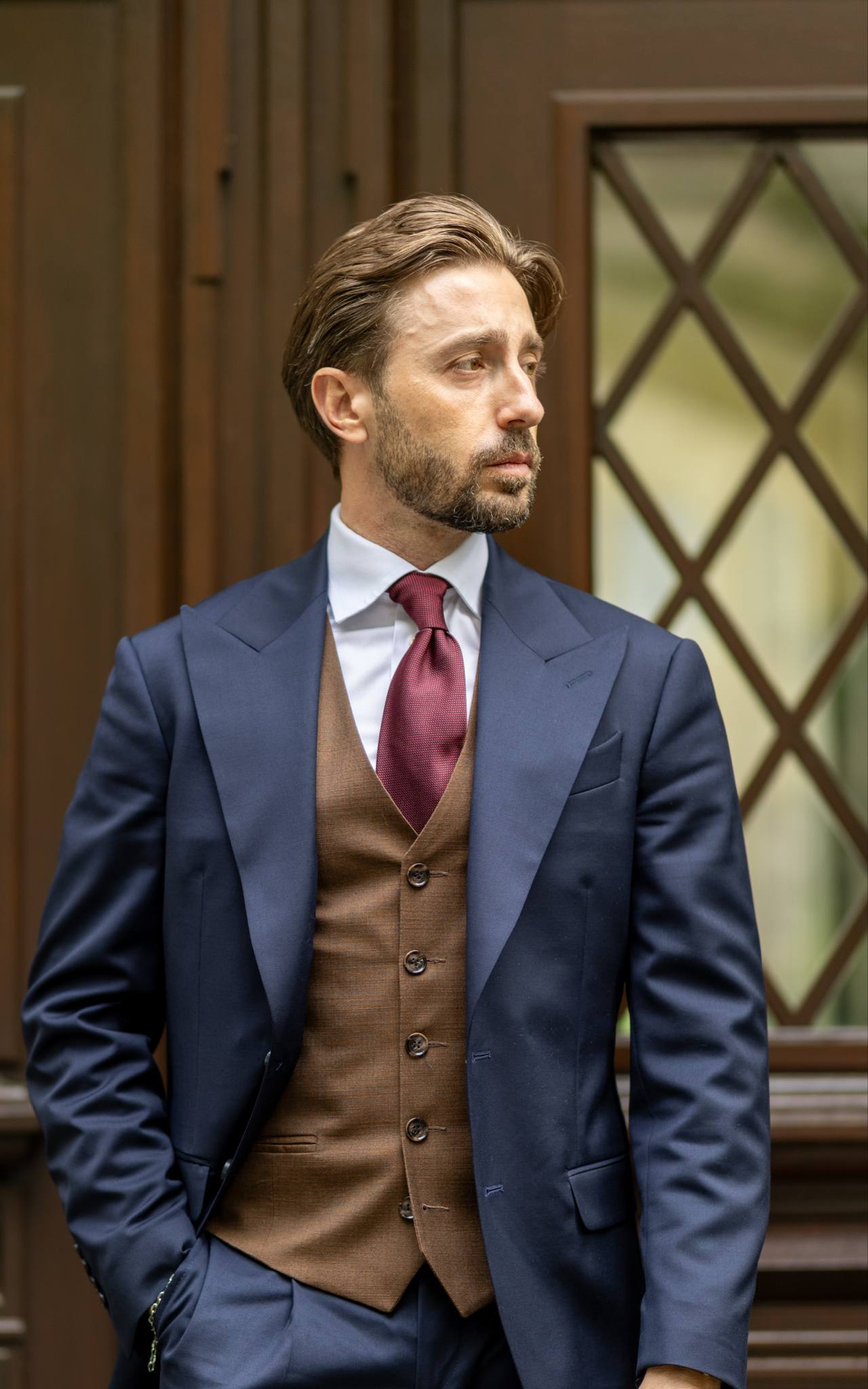 Kamizelka jednorzędowa w kolorze brązowym została uszyta z mieszanki jedwabiu (60%) i wełny (40%) od włoskiego producenta Zenia. Model posiada jednorzędowy klasyczny krój, plecy z tej samej tkaniny co przód oraz pasek regulacyjny, dzięki czemu idealnie dopasowuje się do sylwetki i świetnie sprawdza w zestawach smart casualowych.