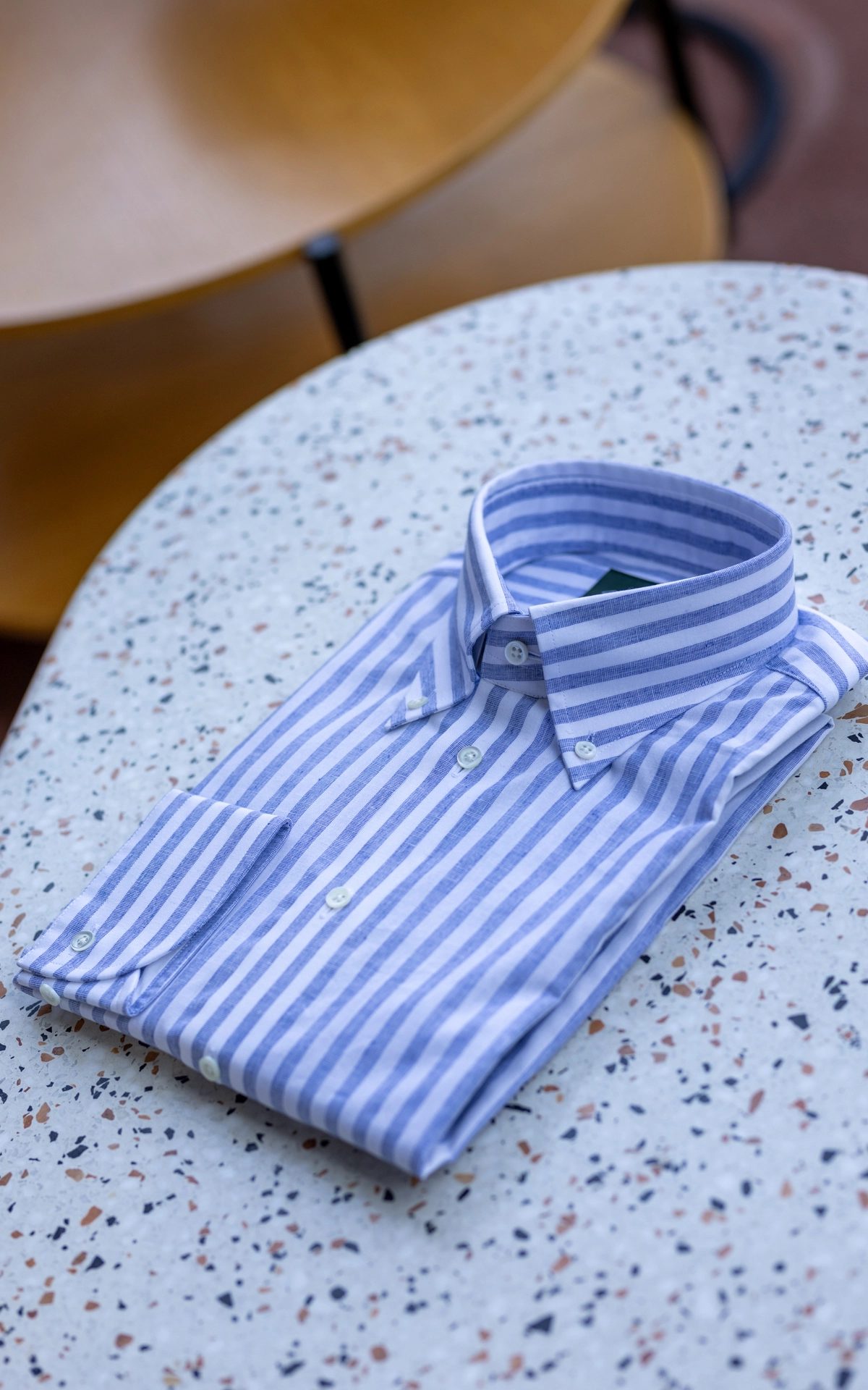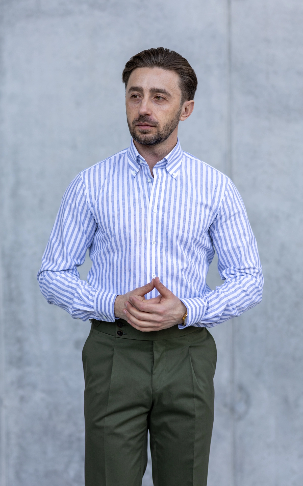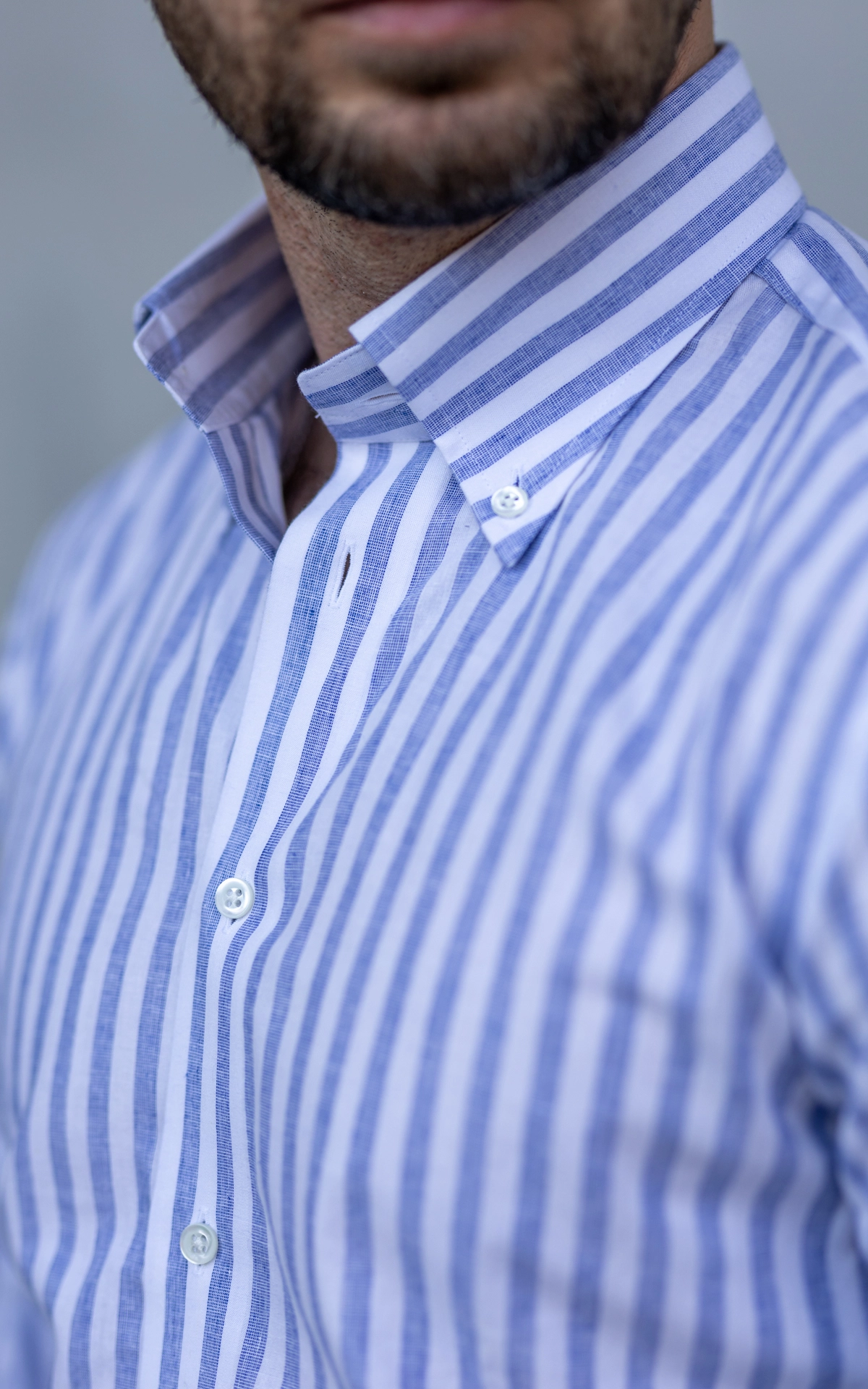 Elegancka koszula męska w klasycznym kolorze, uszyta z 70% bawełny i z 30% z lnu. Model z kołnierzykiem button-down, perłowymi guzikami przyszytymi metodą Ascolite i szwami bieliźnianymi, zapewnia wygodę i estetyczne wykończenie wnętrza. Uniwersalna - idealna do garnituru, marynarki lub samodzielnych stylizacji smart casual.